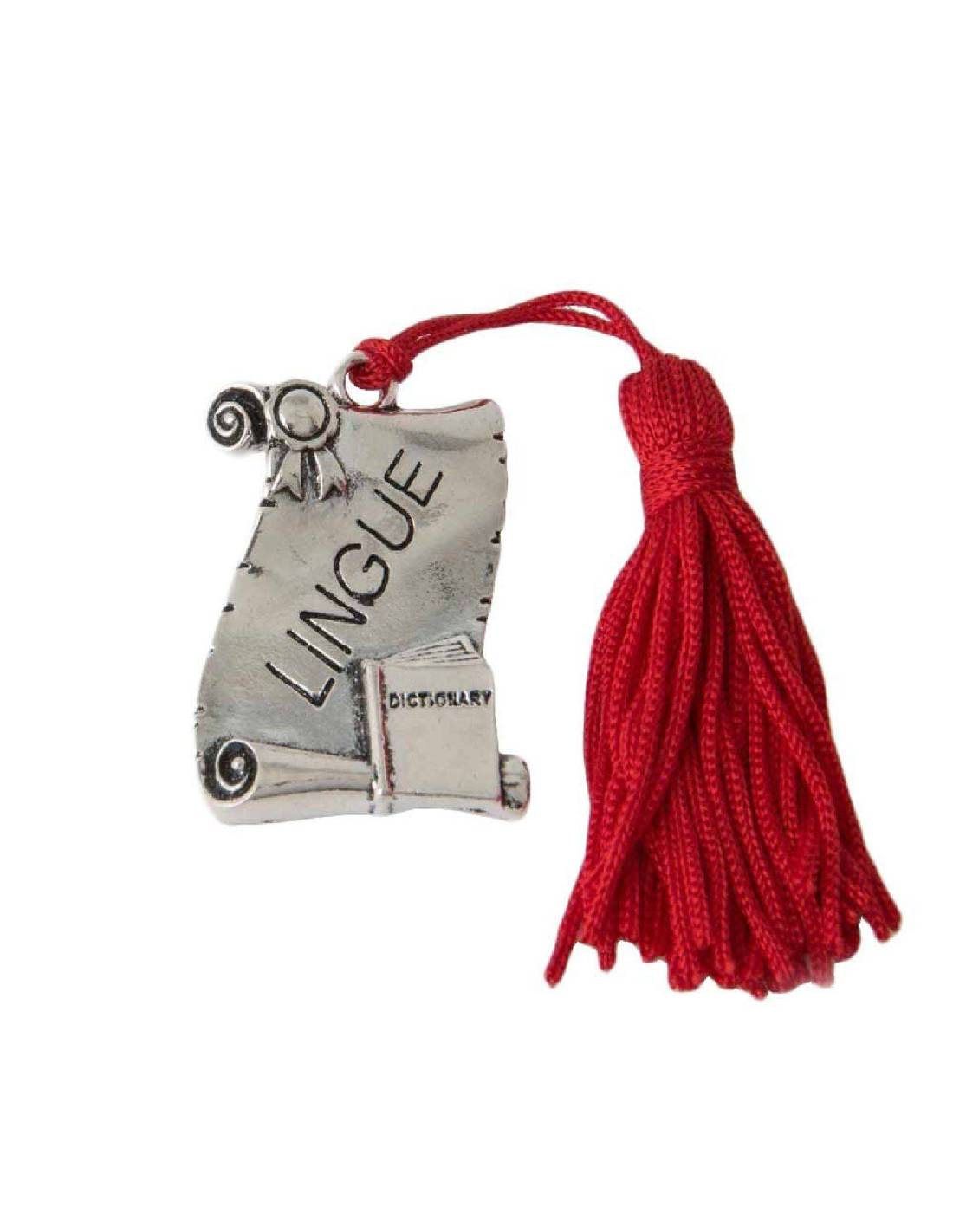 Pergamena targhetta in lingue (misura circa 4cm) in zama (lega tipo argento invecchiato che non annerisce) con su incisa la parola 'lingue' adatta per bomboniere per laurea.