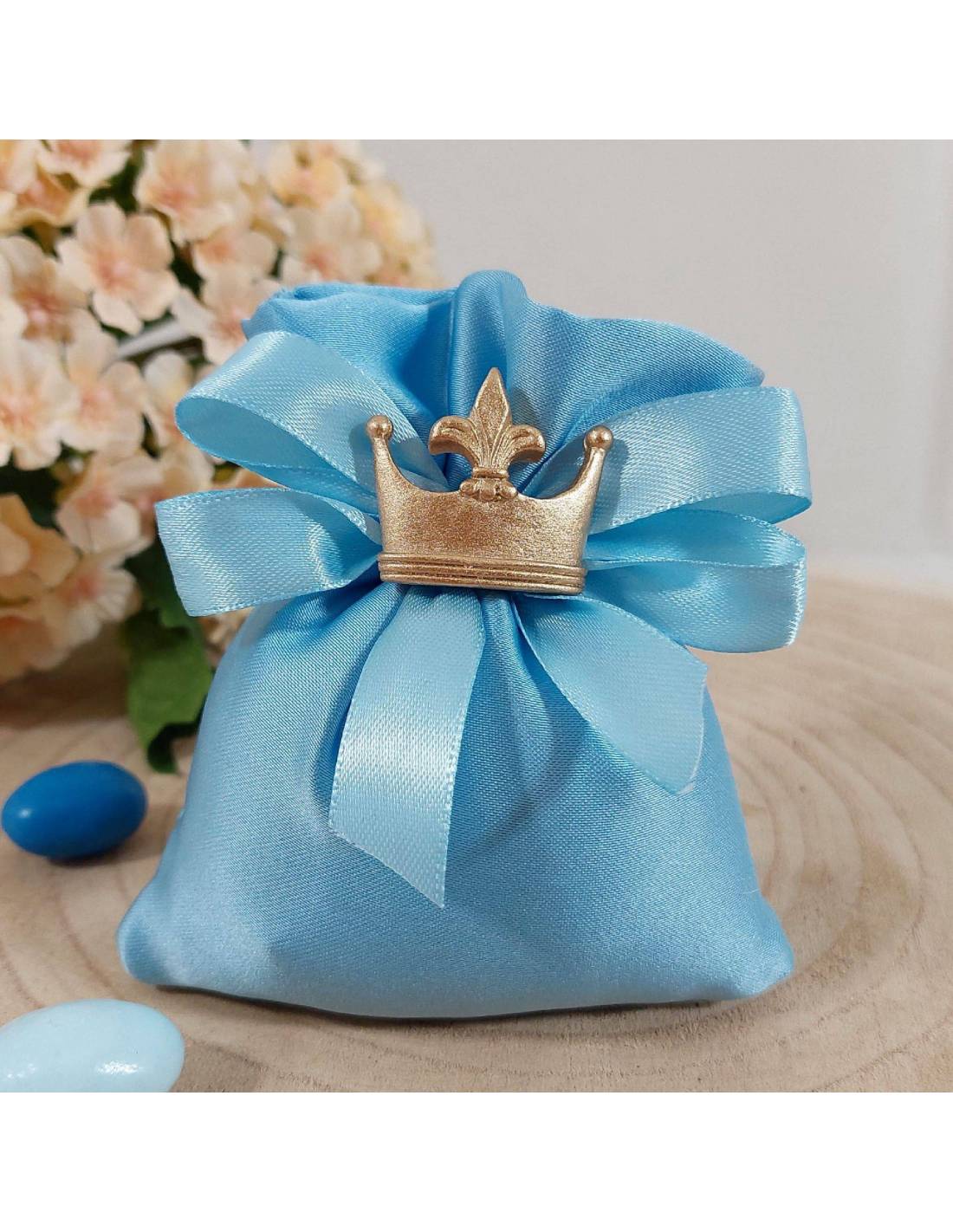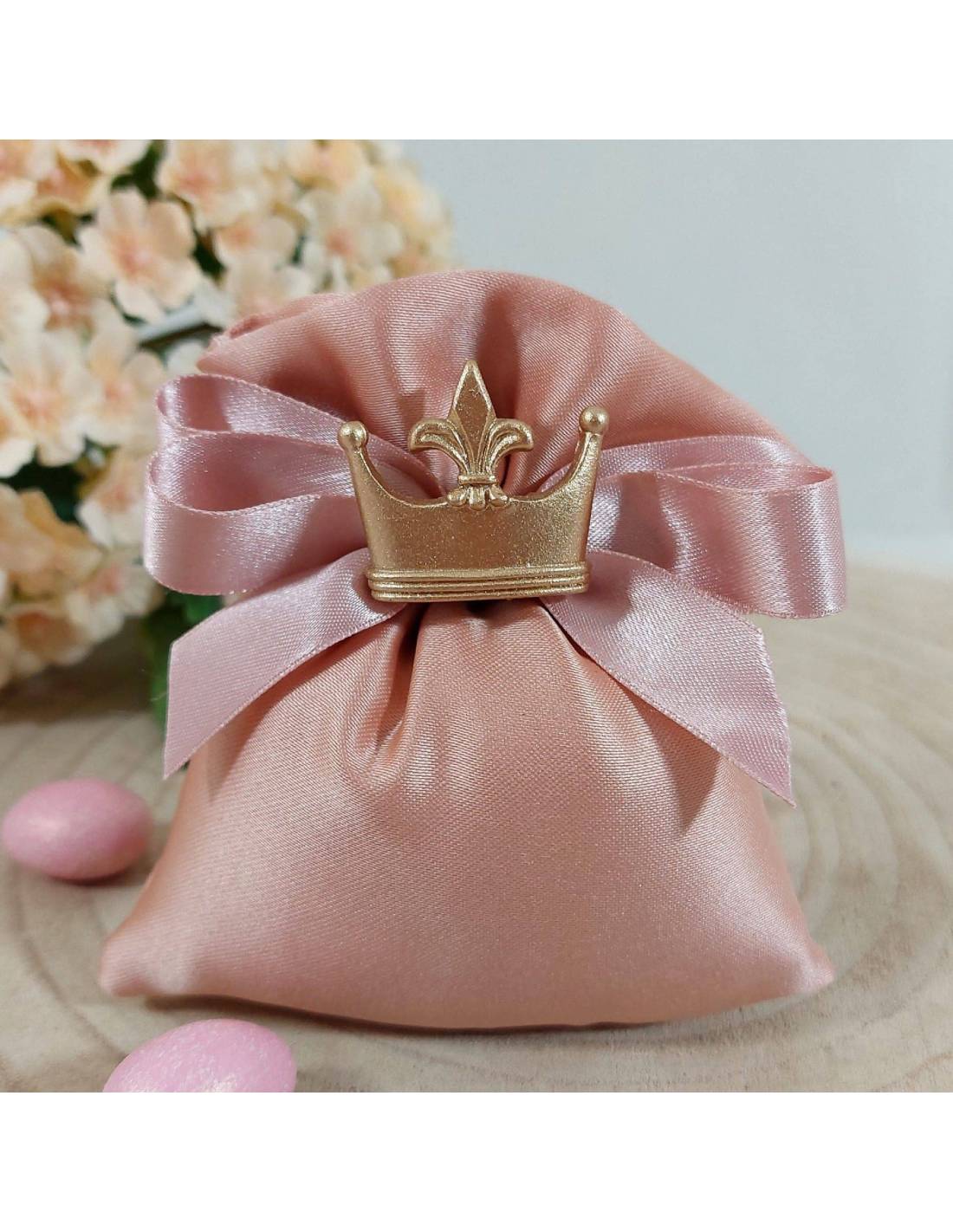 La coroncina magnete abbinata al sacchetto è confezionata come in foto pronta da regalare con confetti all'interno dovrai solo inserire il bigliettino nel portabiglietto dietro al sacchetto.