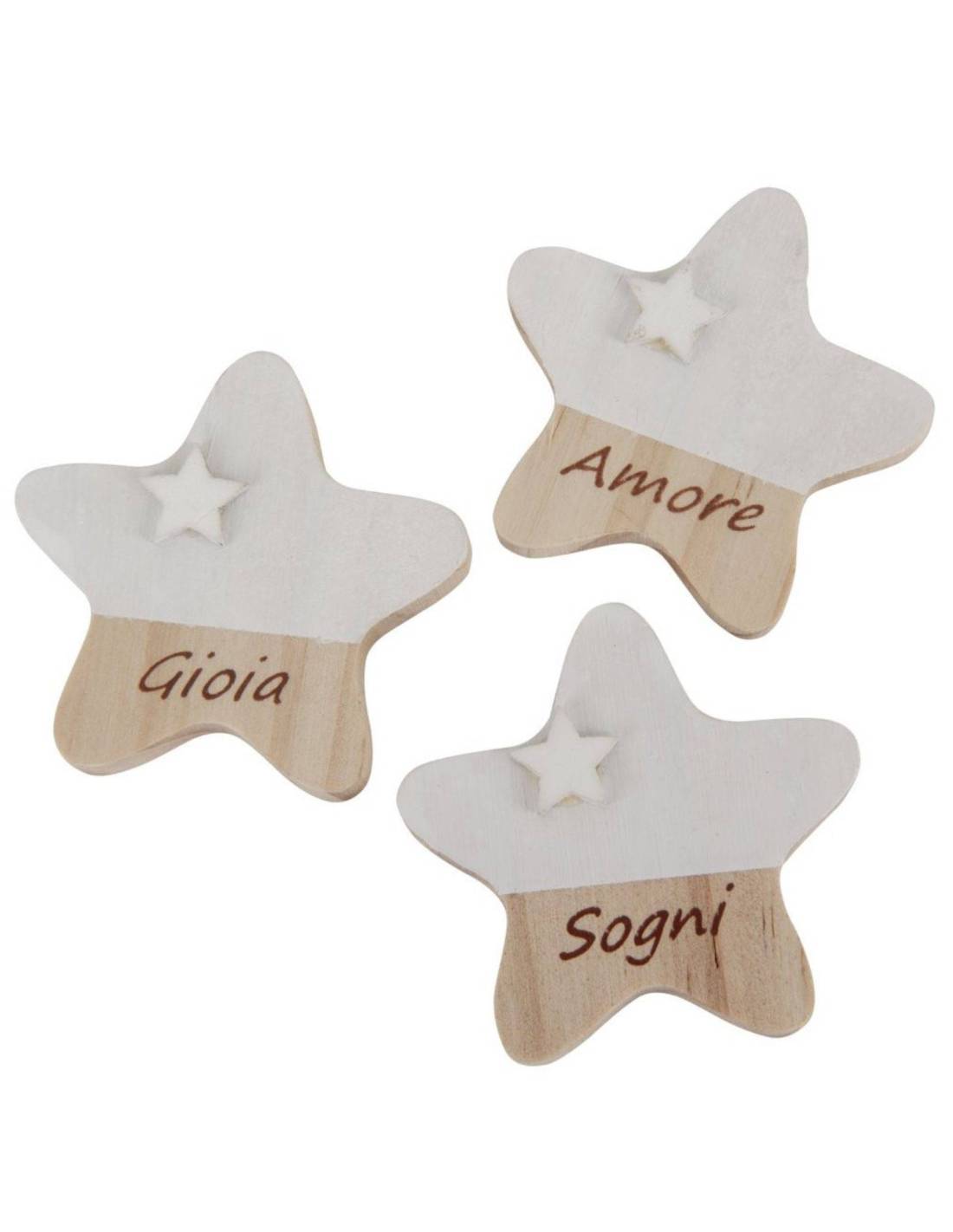 Il prezzo si riferisce ad un solo magnete in legno legno per bomboniere nascita o Battesimo bambino. Calamite a forma di stella bicolore legno naturale e celeste con le scritte Amore, Sogni e Gioia e una stellina bianca come decoro.