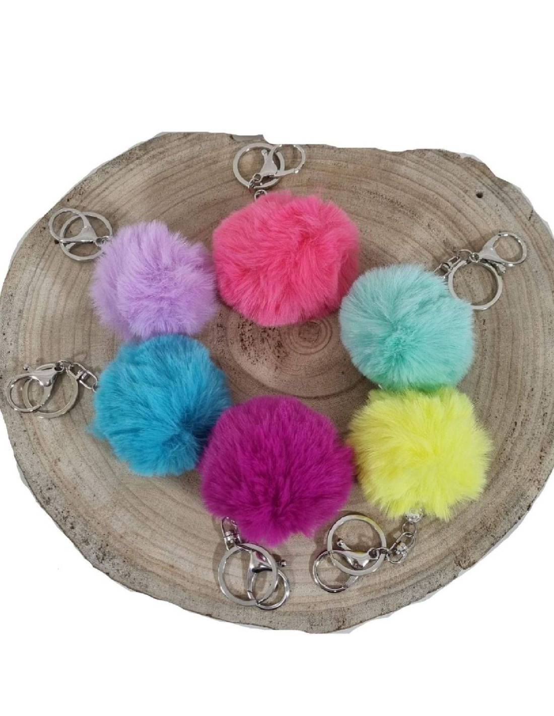 Bomboniere portachiavi fai da te cpn pon pon peluche in sei colori tiffany, fucsia, ottanio, lilla, turchese e giallo.