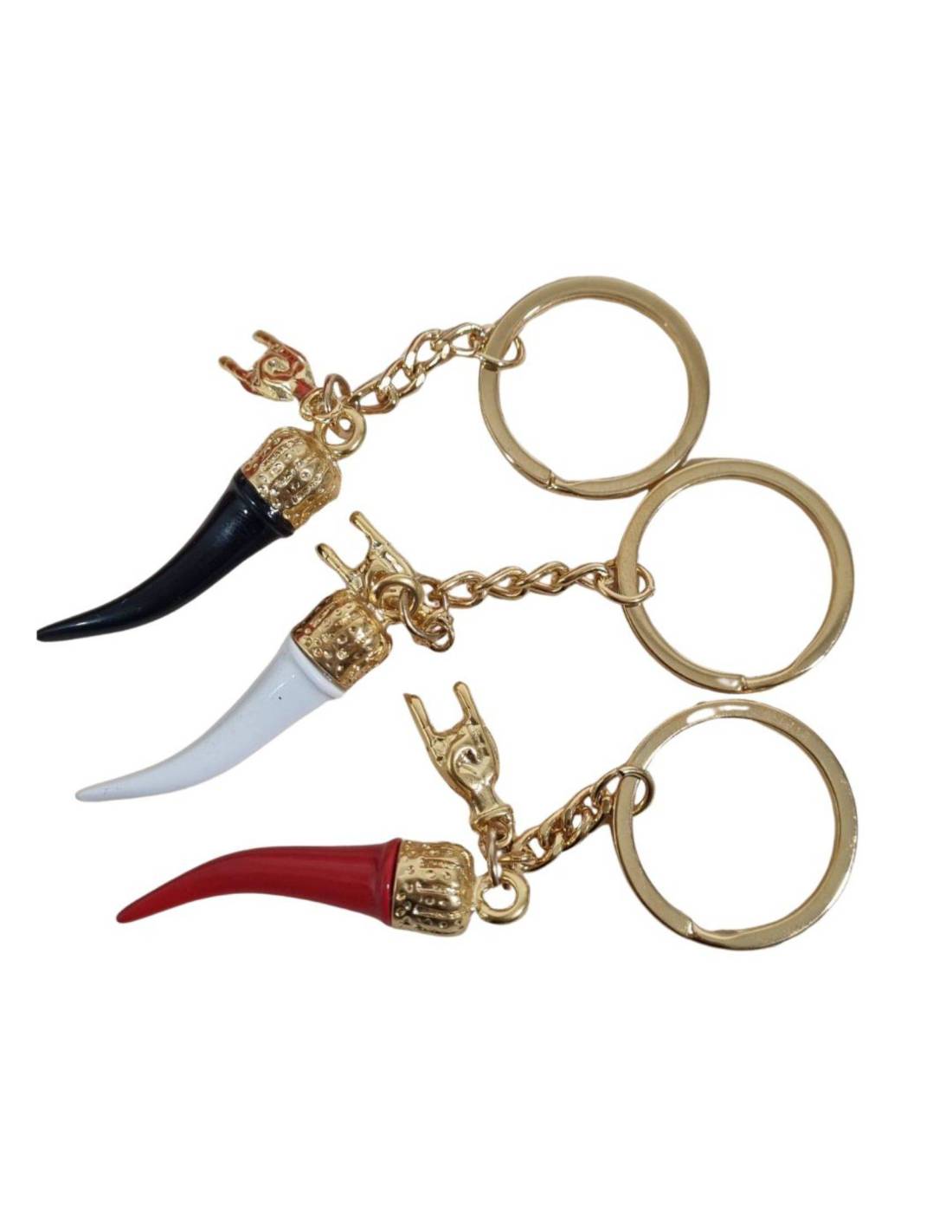 Portachiavi corno e corna in acciaio dorato e smaltato bianco, rosso o nero ideali per ogni evento.