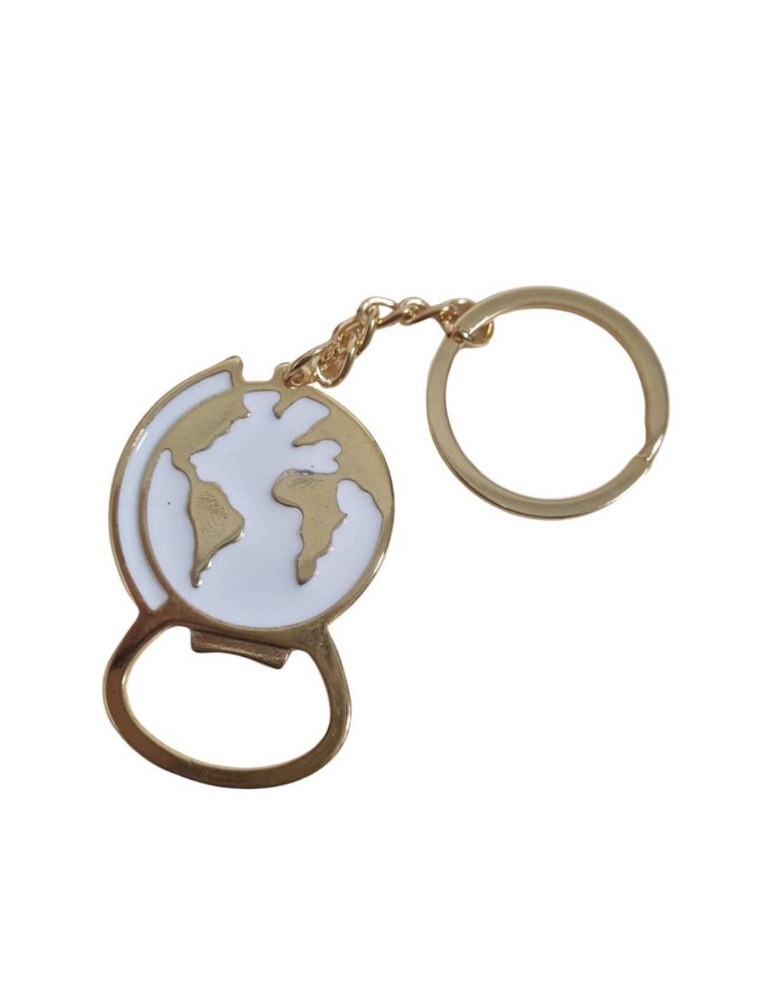 Portachiavi mappamondo utili  in acciaio dorato e smaltato bianco ideali per ogni evento.
