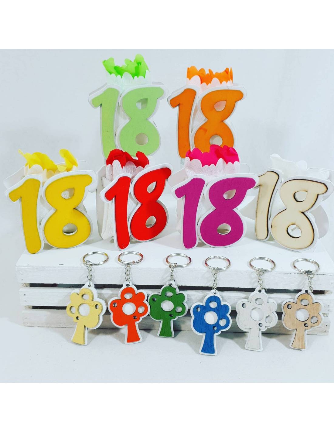 La torta di bomboniere diciottesimo ha sulle fette le clip in resina a forma di 18 di colori assortiti, oltre che a confetti e bigliettino personalizzato. In cima alla struttura è presente una centrale che raffigura un 18.