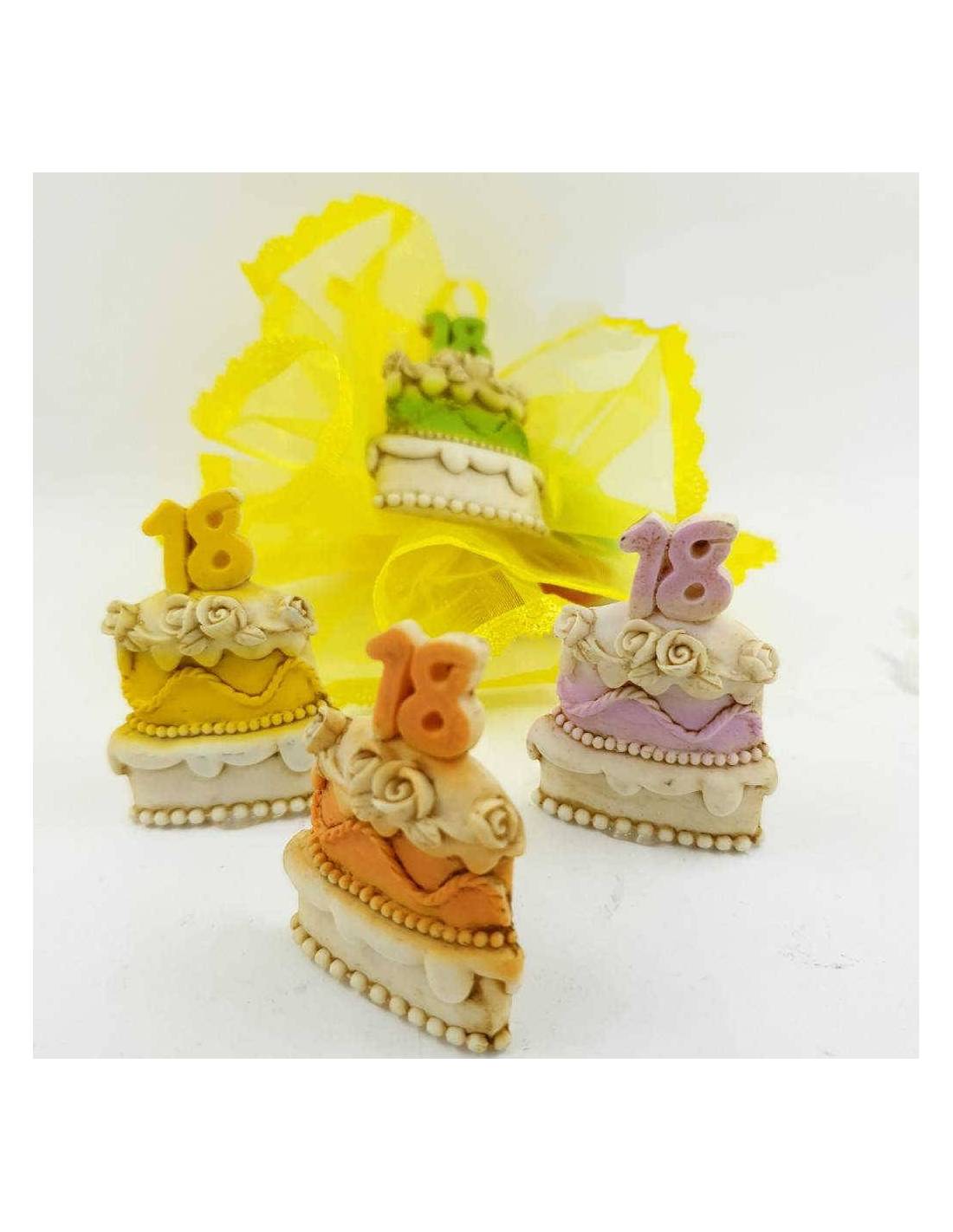 Magnete a forma di torta decorata in quattro colori con il numero 18 come topper per bomboniere particolari per 18 anni ragazza.