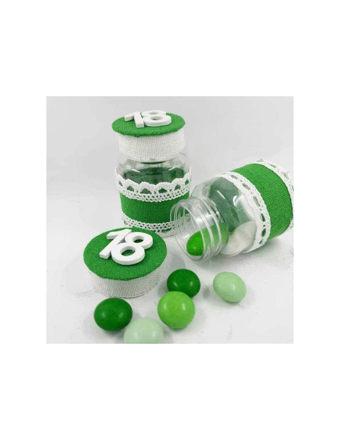 Barattolino per confetti 18 anni rigido decorato con stoffa verde e merletto bianco come il tappo che in più ha il numero 18 bianco in legno.