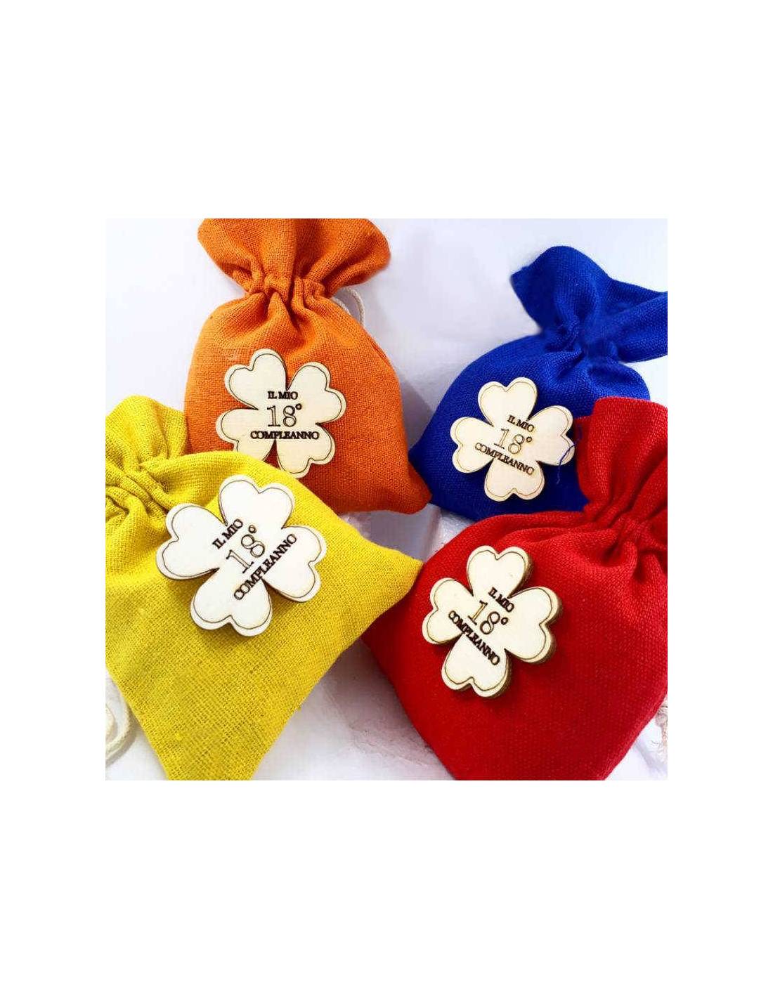 Per ogni sacchetto 18 anni è applicato un quadrifoglio in legno con l'incisione IL MIO 18° COMPLEANNO.