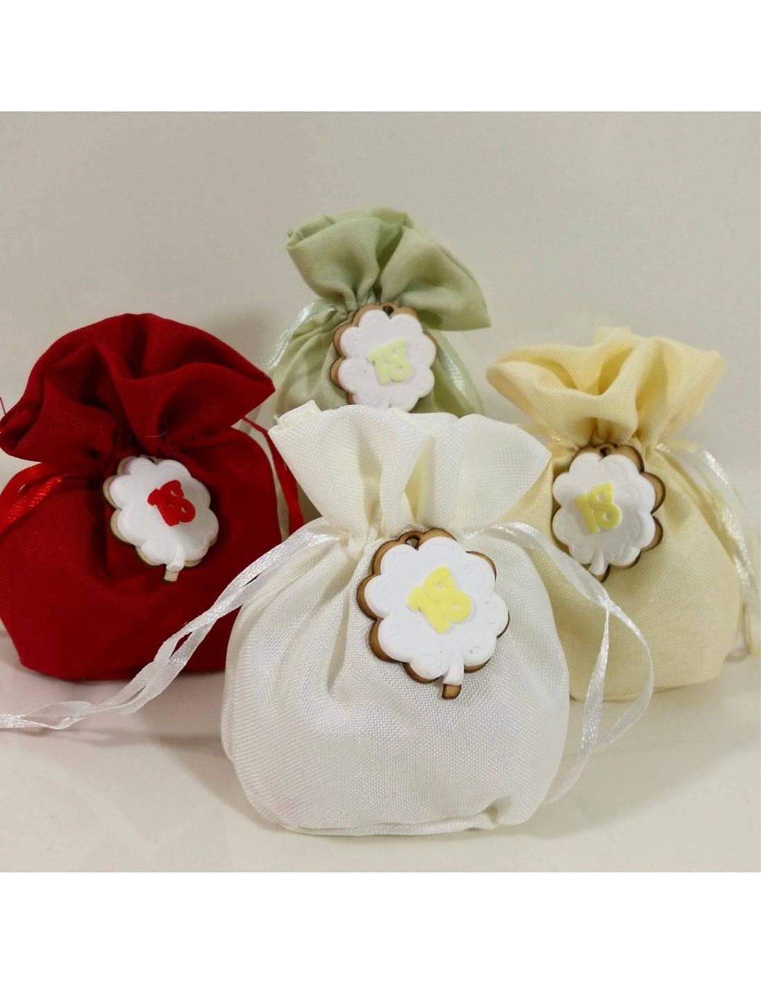 Sacchetti in 4 colori con applicazione a froma di quadrifoglio e al centro il numero 18 per realizzare delle particolari bomboniere diciotto anni.