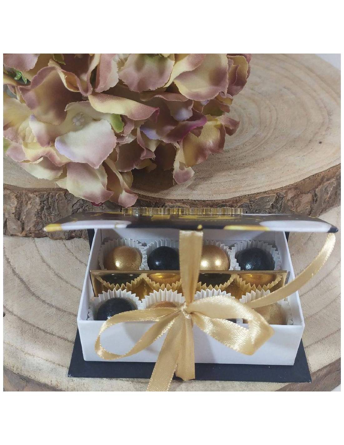 Scatole portaconfetti diciottesimo compleanno tema nero e oro personalizzate con il nome in plexiglas dorato.