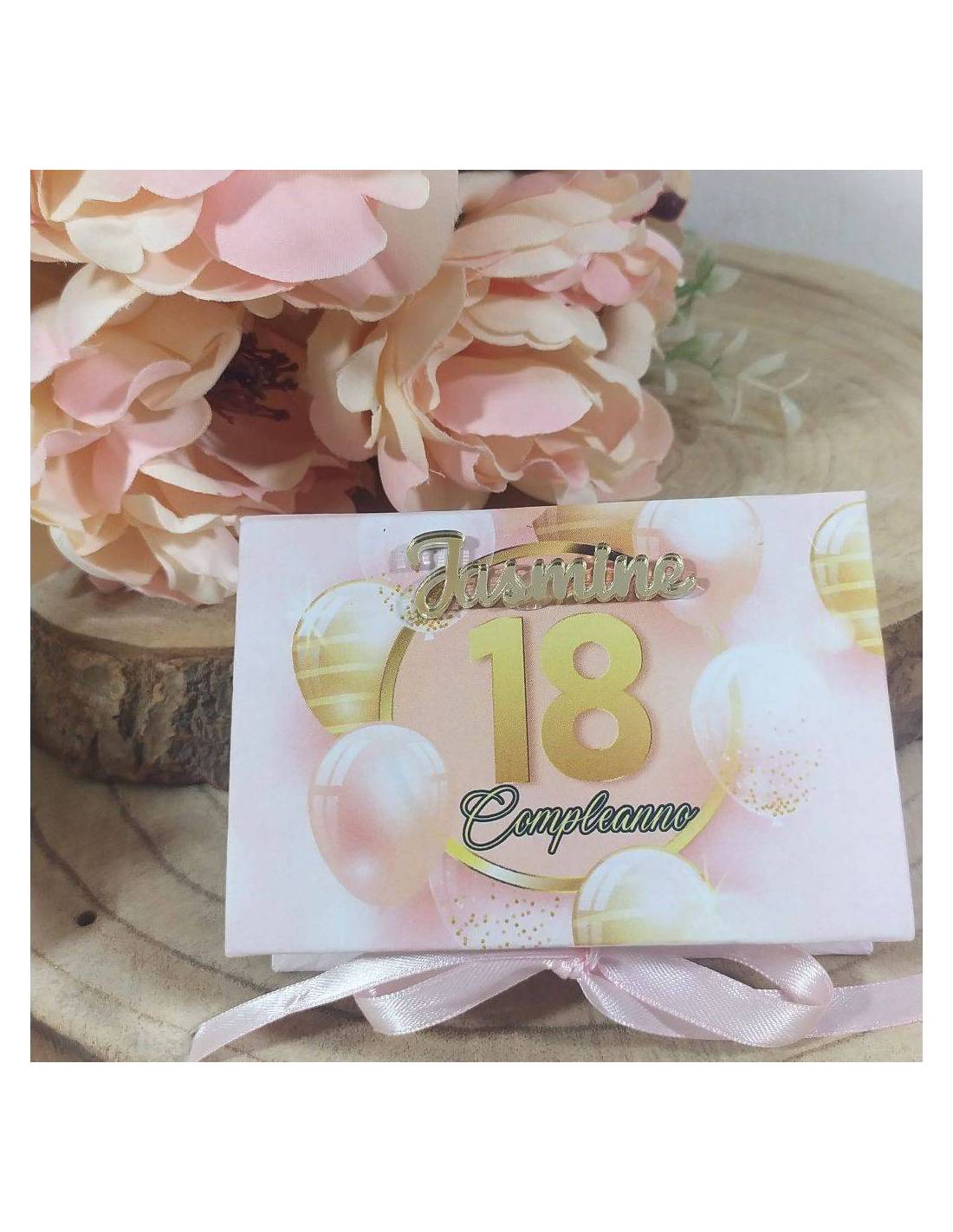 Scatole portaconfetti diciottesimo compleanno tema rosa e oro personalizzate con il nome in plexiglas dorato.