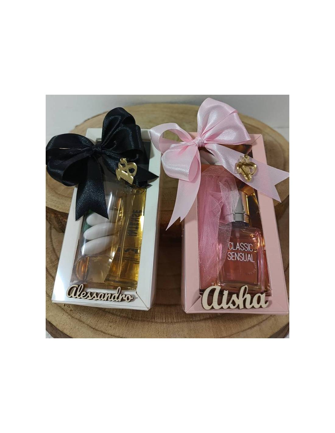 Bomboniere profumi mignon equivalenti da 15 ml personalizzati con nome festeggiata/o in scatola con confetti.