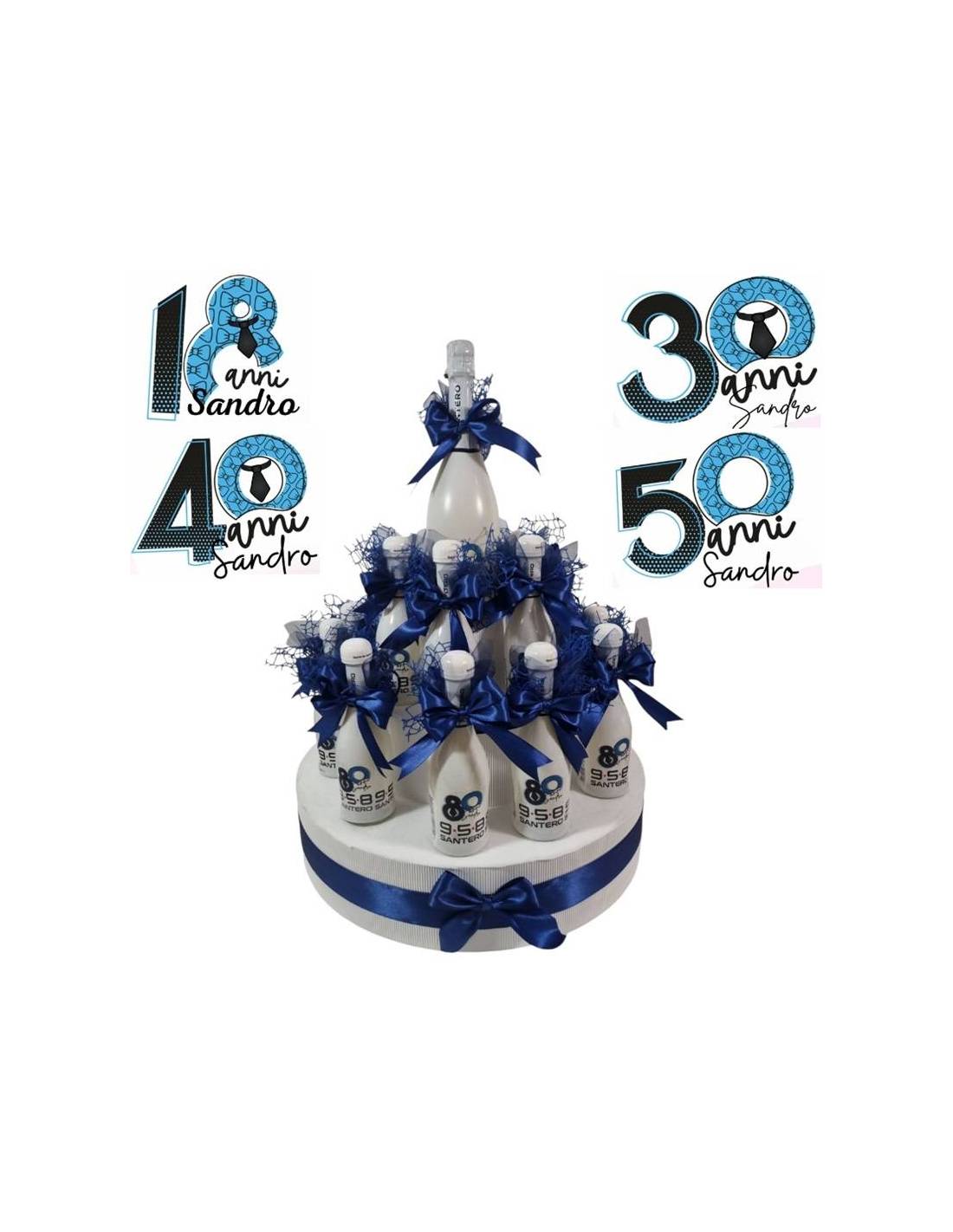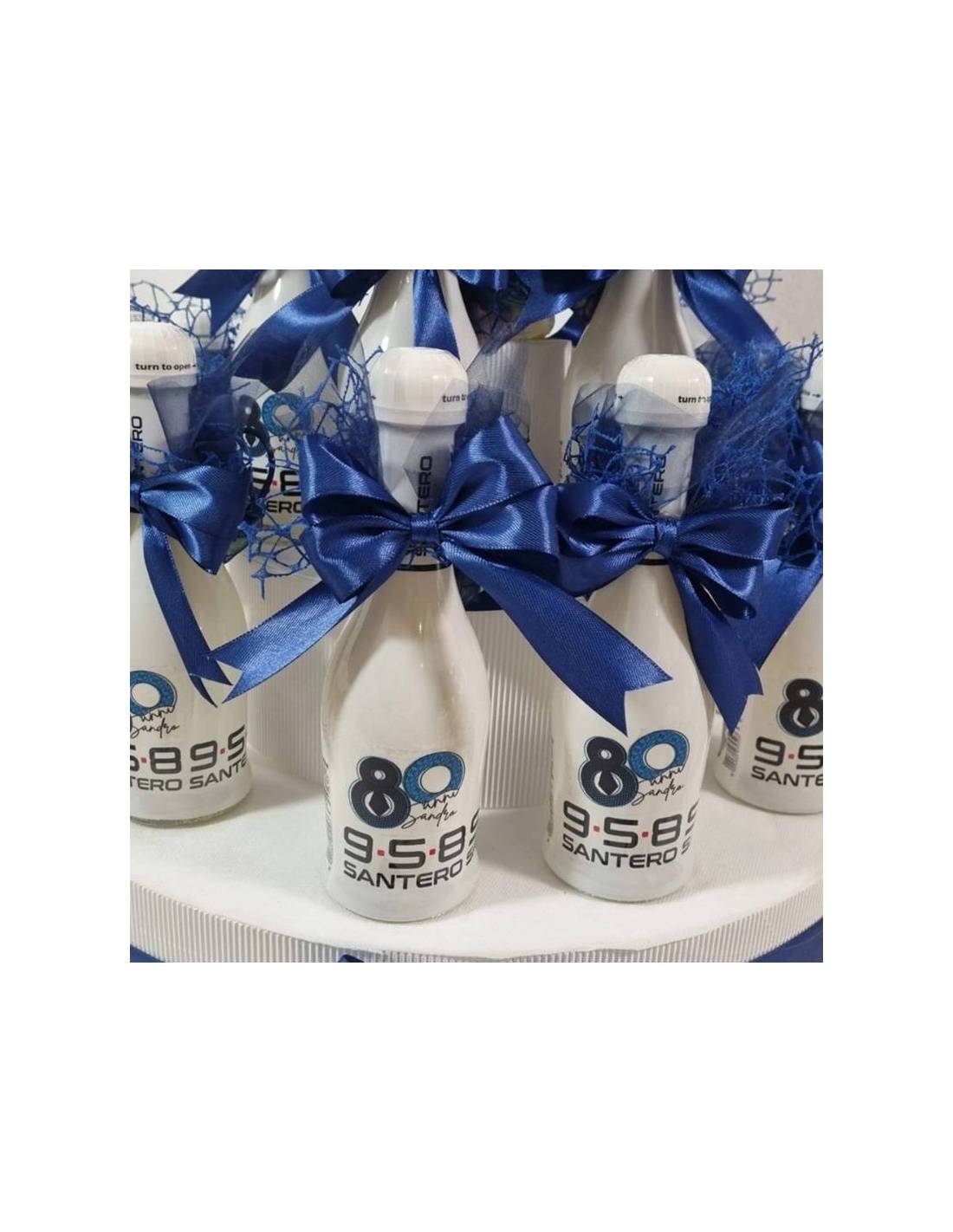 Bottiglie Santero piccole personalizzate con incluso sacchetto portaconfetti attaccato al collo della bottiglia con all'interno 5 confetti al cioccolato.
