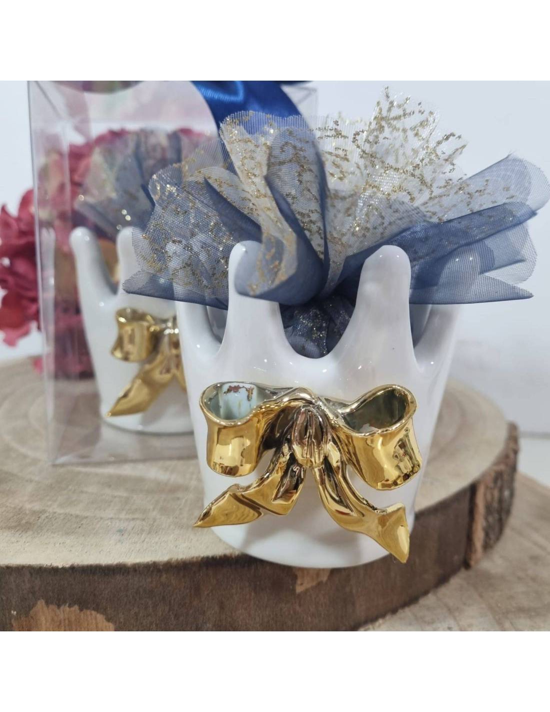 Bomboniere corona in porcellana bianca e fiocco dorato