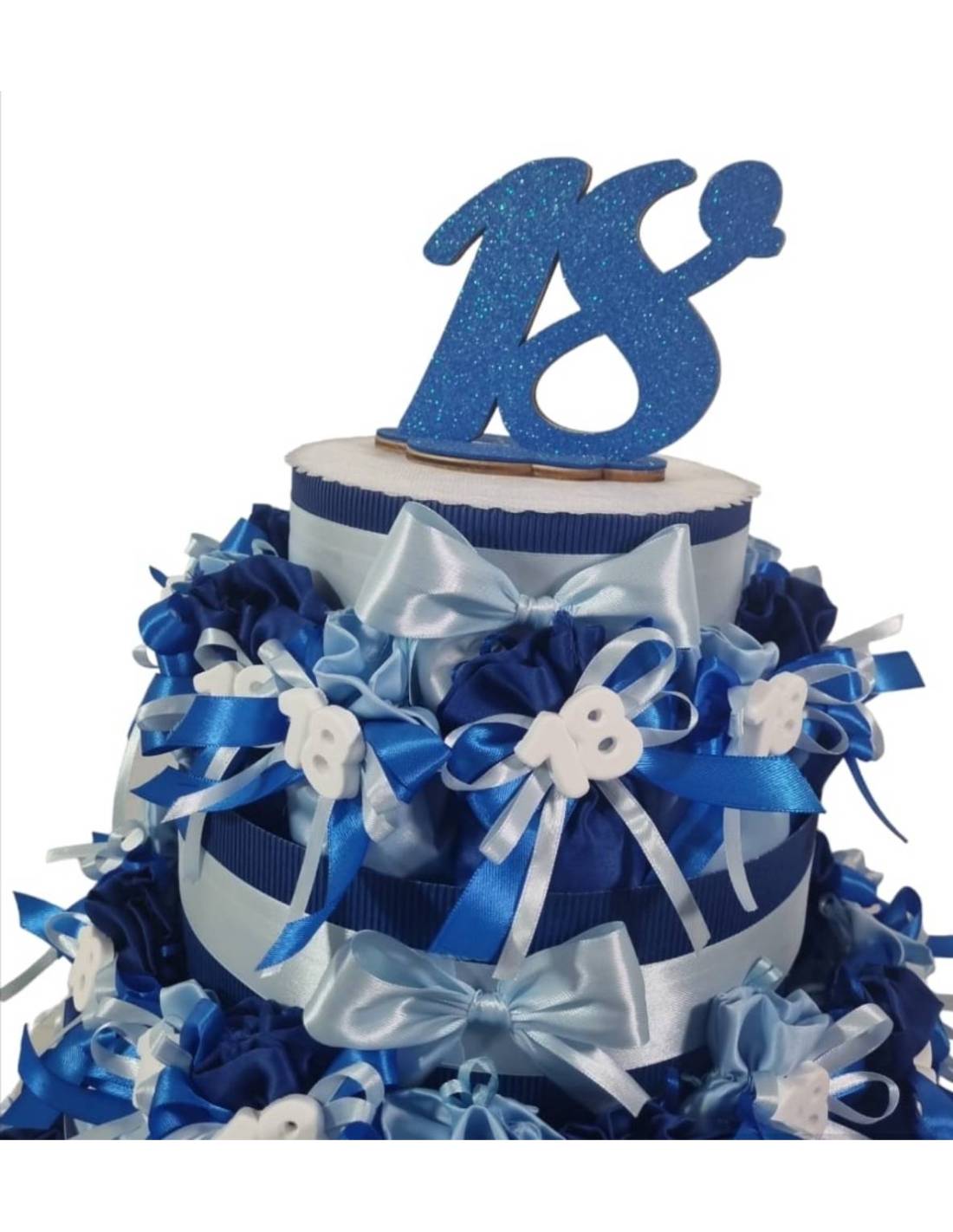 Bomboniere 18 anni ragazzo e ragazza sacchetti blu e azzurri decorati con fiocco e gessetto a numero di 18.