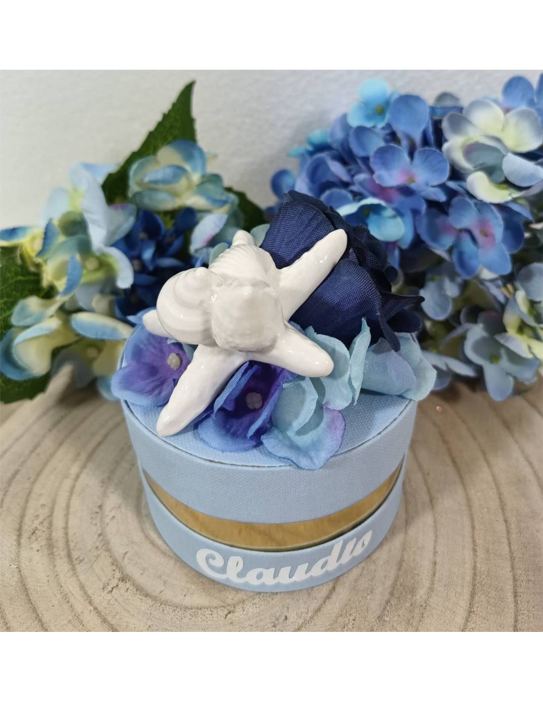 Scatola degustazione confetti di colore azzurro e oro decorato con fiori e stella marina in ceramica.