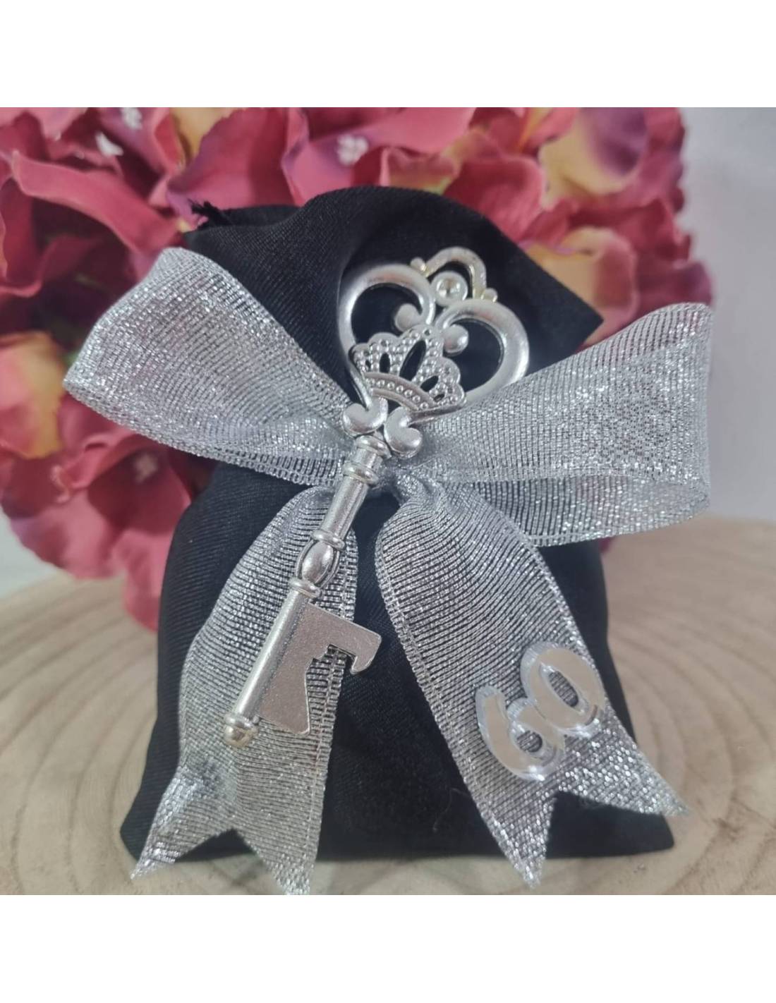 Sacchetto confezionato come in foto con fiocco argentato e apribottiglie in metallo a forma di chiave.