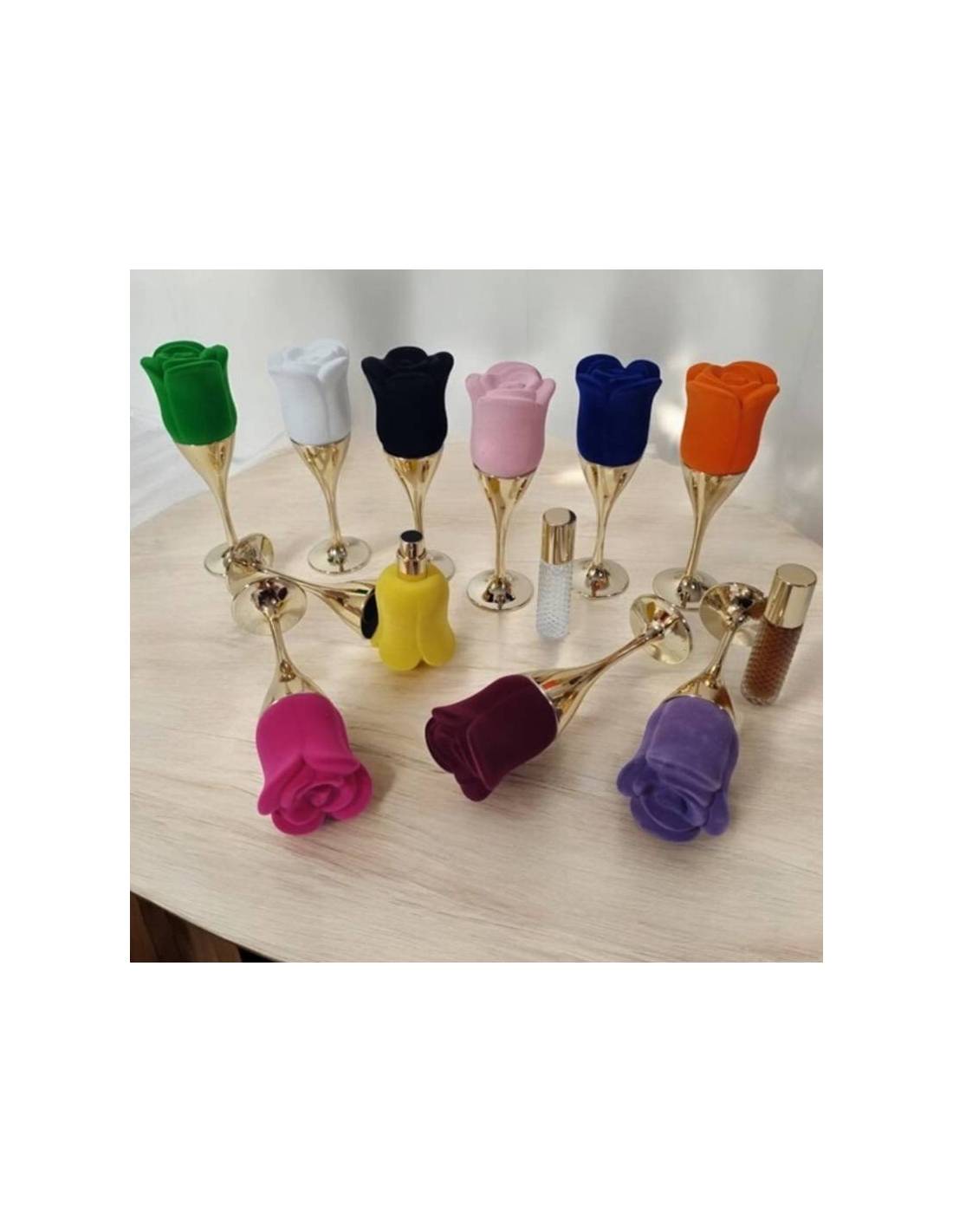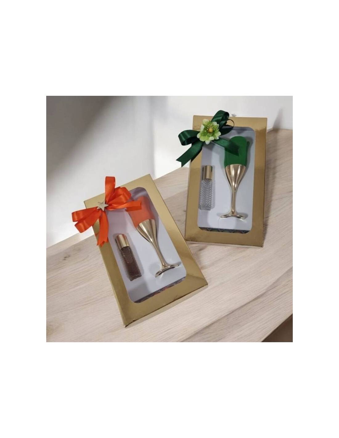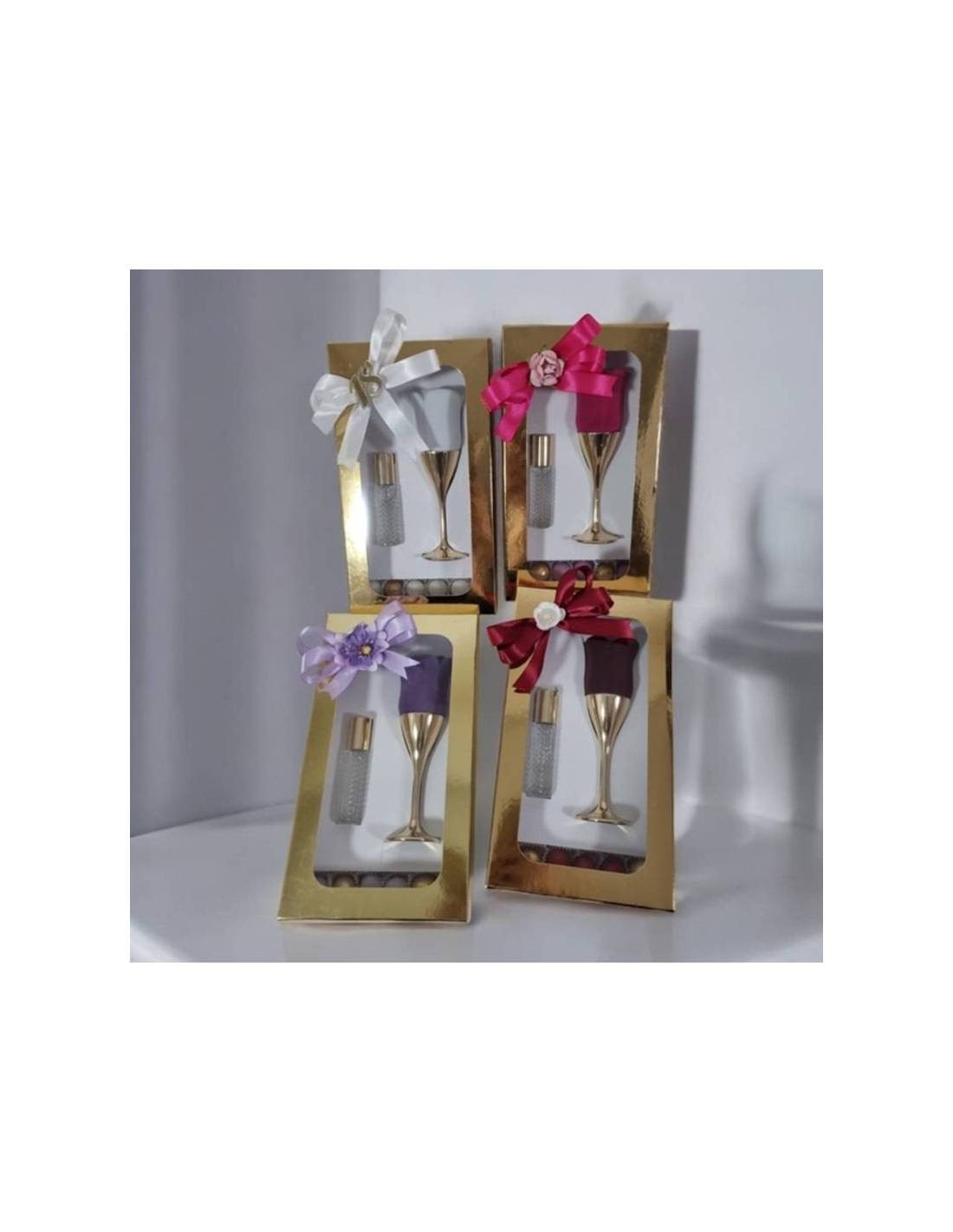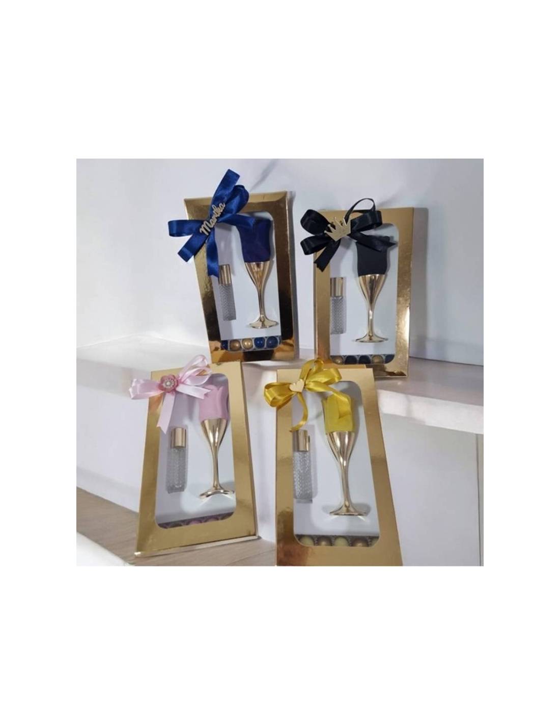 Calice dorato con rosa in velluto e all'interno essenza profumata e profumo in bottiglietta completi di scatola con scomparto per mettere i confetti con i pirottini che sono inclusi nel prezzo insieme al nastro.