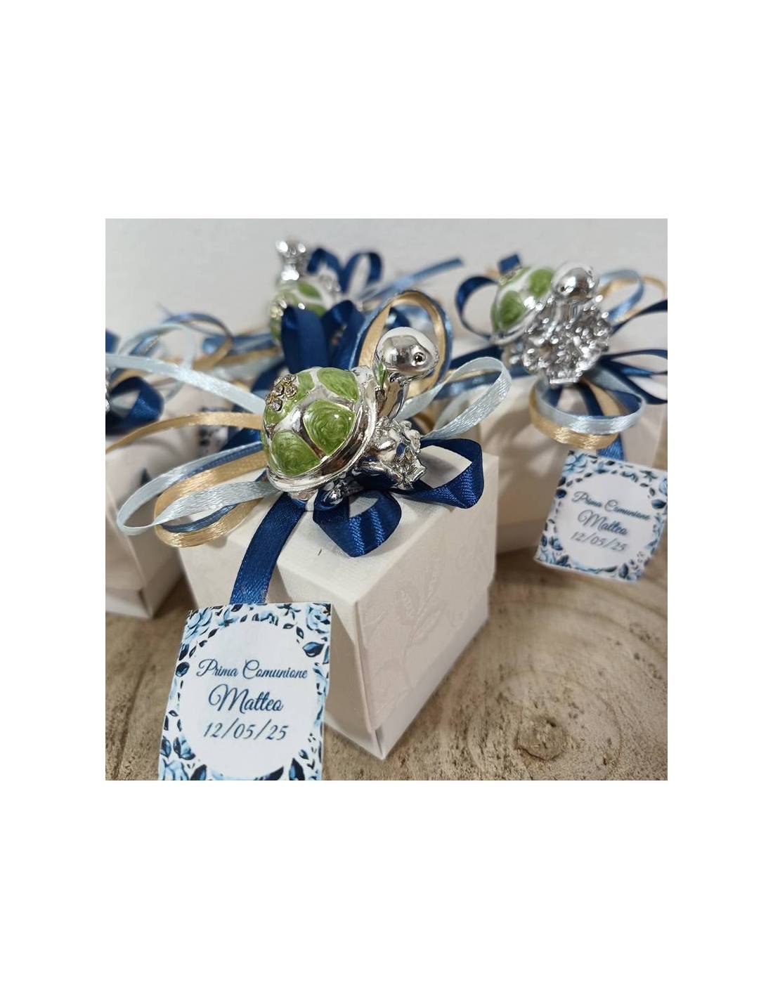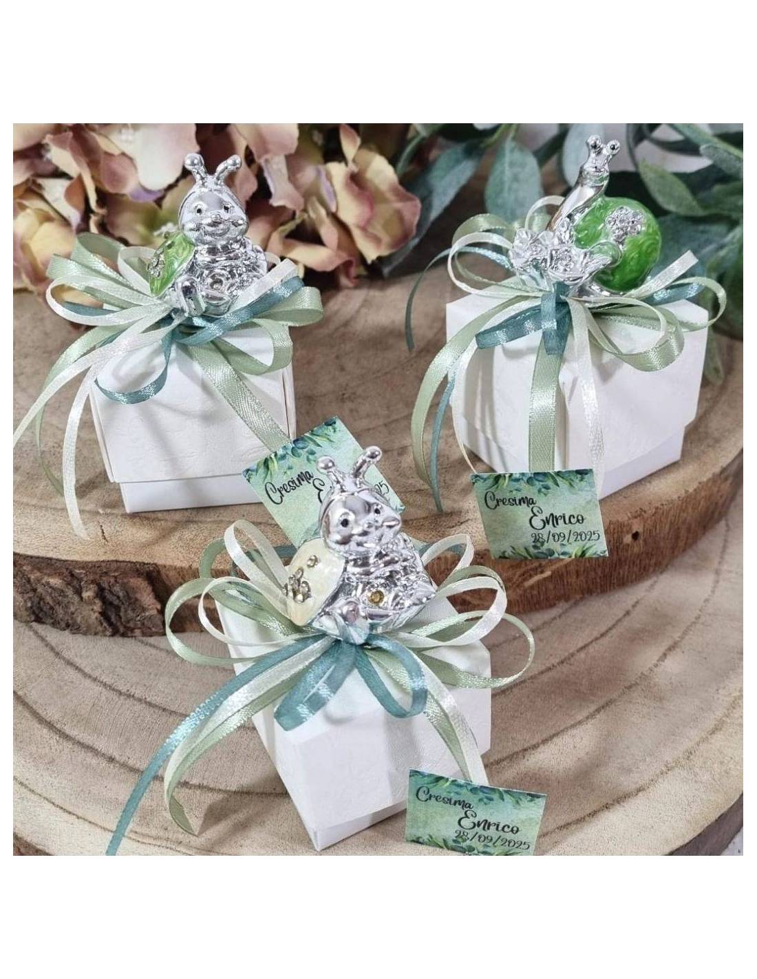 Animali in resina argentati e satinati con strass confezione a vista su scatolina con confetti all'interno. Scatoline portaconfetti decorate con nastri e tag personalizzato.