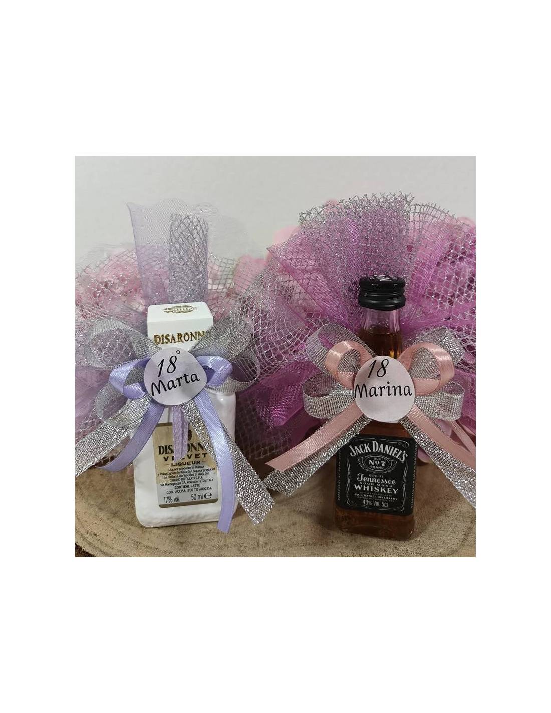 Liquori mignon bomboniere confezionati con sacchetto abbinato con confetti e tag personalizzato.