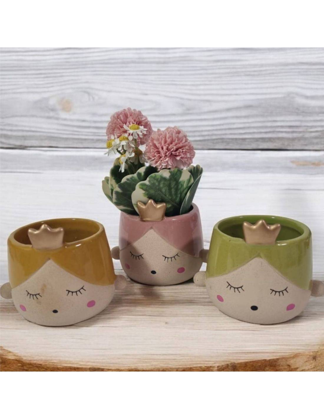 Vasetto in ceramica bimba con le guance rosse in tre colori verde, rosa e ocra che puoi scegliere anche con piantina o fiori (di varie forme ma colori simili)