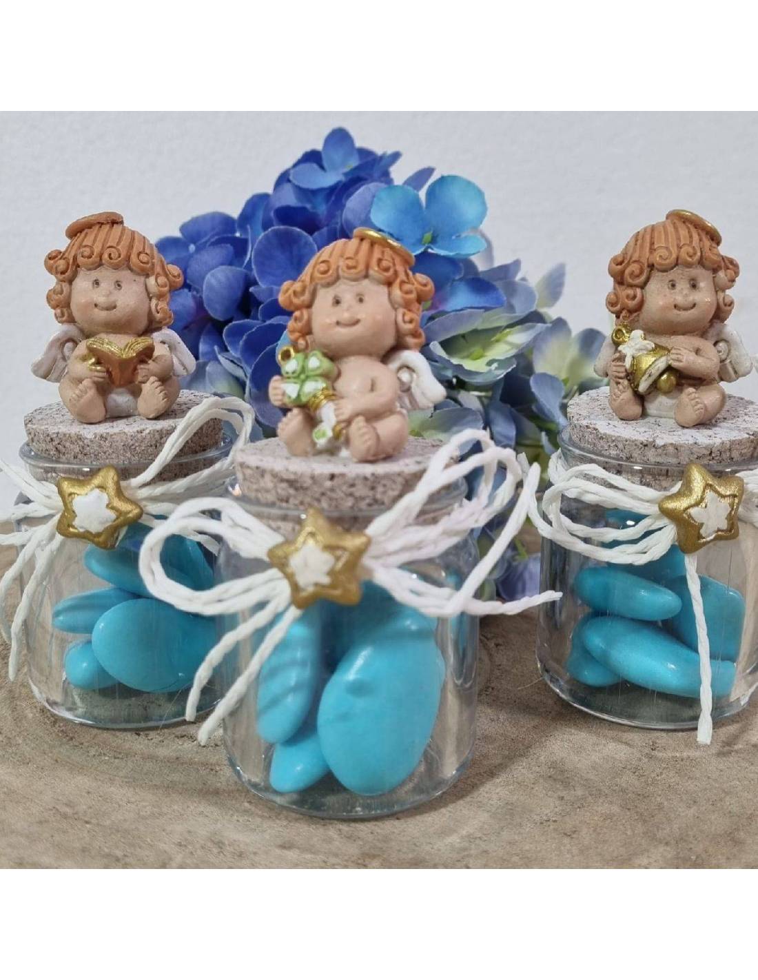 Bomboniere angioletti musicisti con barattolo in vetro decorato.