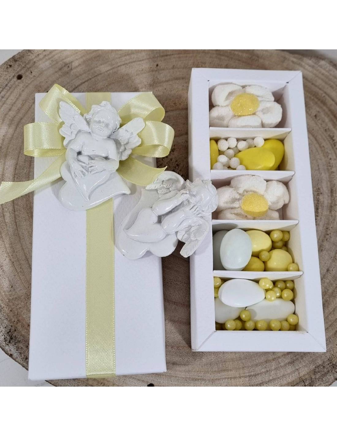 Angioletti bomboniere scatola a scomparti con margherite marshmallow e confetti tutto come in foto.