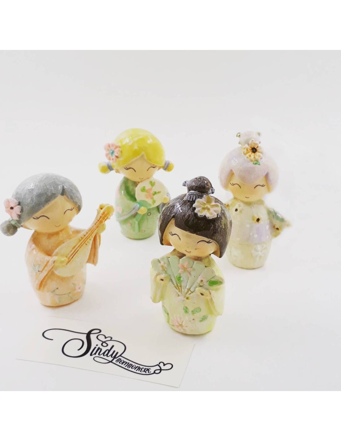 Bellissime e graziose statuine da appoggio in resina lucida raffigurante 4 varianti di bamboline geisha. Ognuna di queste giapponesine possiede una capigliatura e kimono differente alle altre.