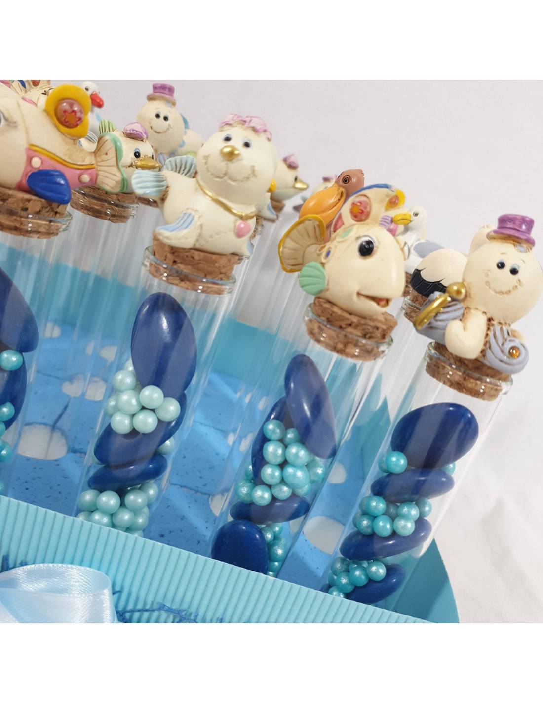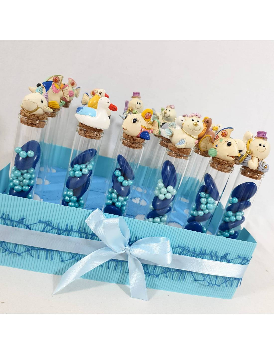 Cestino con 24 provette con animaletti acquatici: polipo,cigno, pesciolini, anatroccolo, delfino. Questa offerta comprende il cesto come in foto con nastro a rete e raso dai colori del mare, provette, animaletti, confetti e mimose il tutto a kit di confezionamento e in più sindy ti regala il bigliettino stampato per completare così queste originali bomboniere tema mare maschietto per Battesimo