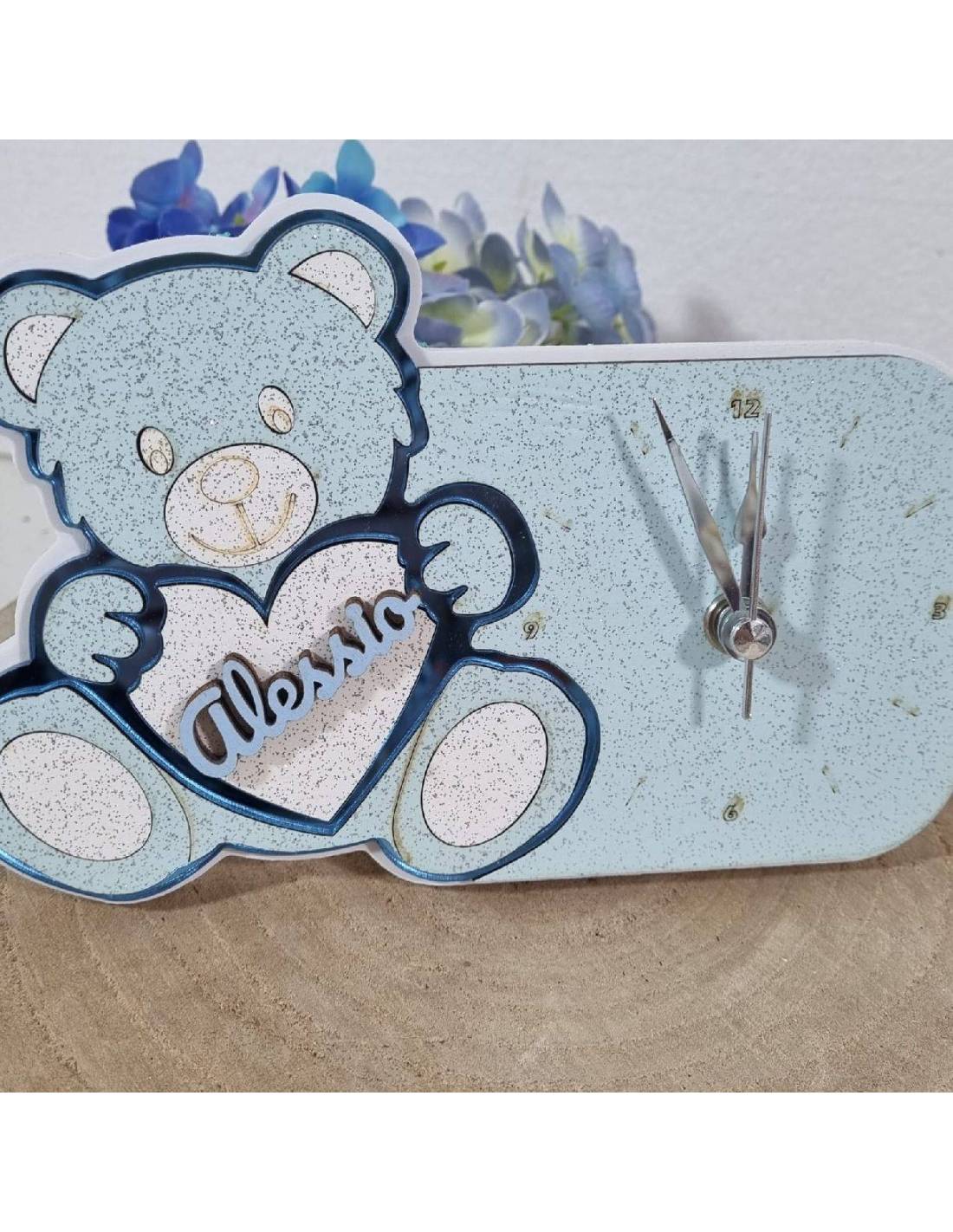 Il vasetto in vetro portaconfetti bimbo Battesimo ha il ciondolo a forma di cuore bianco in 2 varianti assortite con culla e con cavalluccio e un fiocco azzurro.