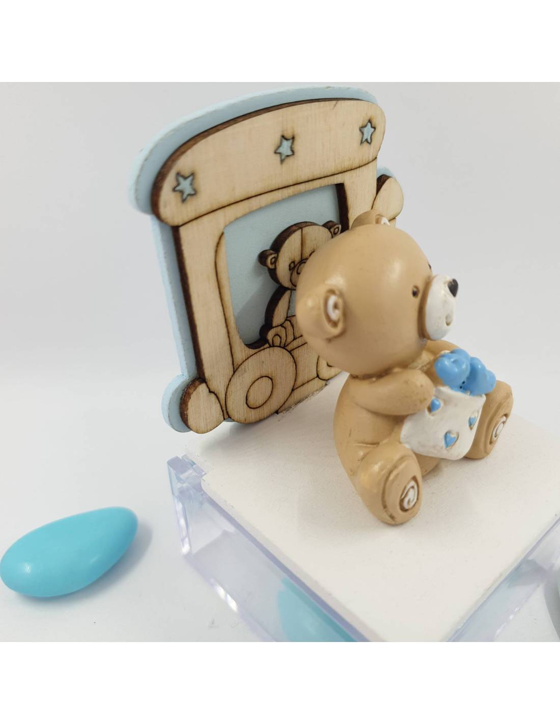 basta inserire i confetti e fermare il coperchio con un pò di colla per ottenere bomboniere Battesimo orsacchiotto maschietto collezione mille cuori confezione a vista. L'orso ha tra le zampe tanti cuoricini azzurri che rendono ideale questi orsetti delle originali idee bomboniere battesimo bambino.