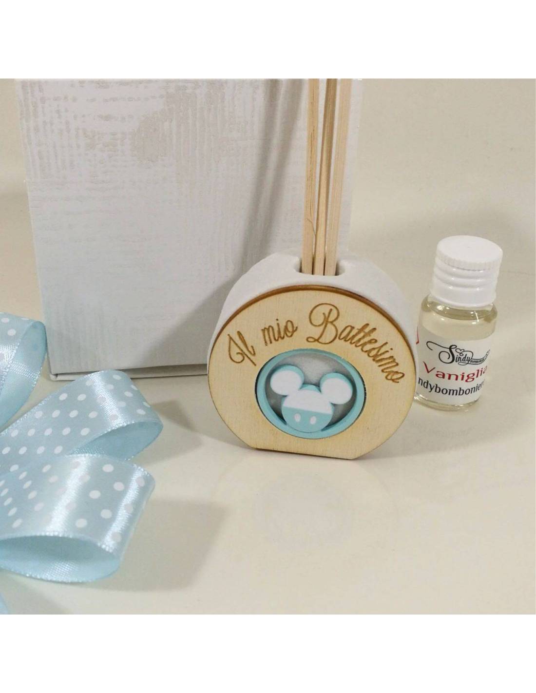 Nel prezzo del profumatore topolino per Battesimo è compreso il profumatore topolino con frase incisa, essenza, scatola e bacchette.