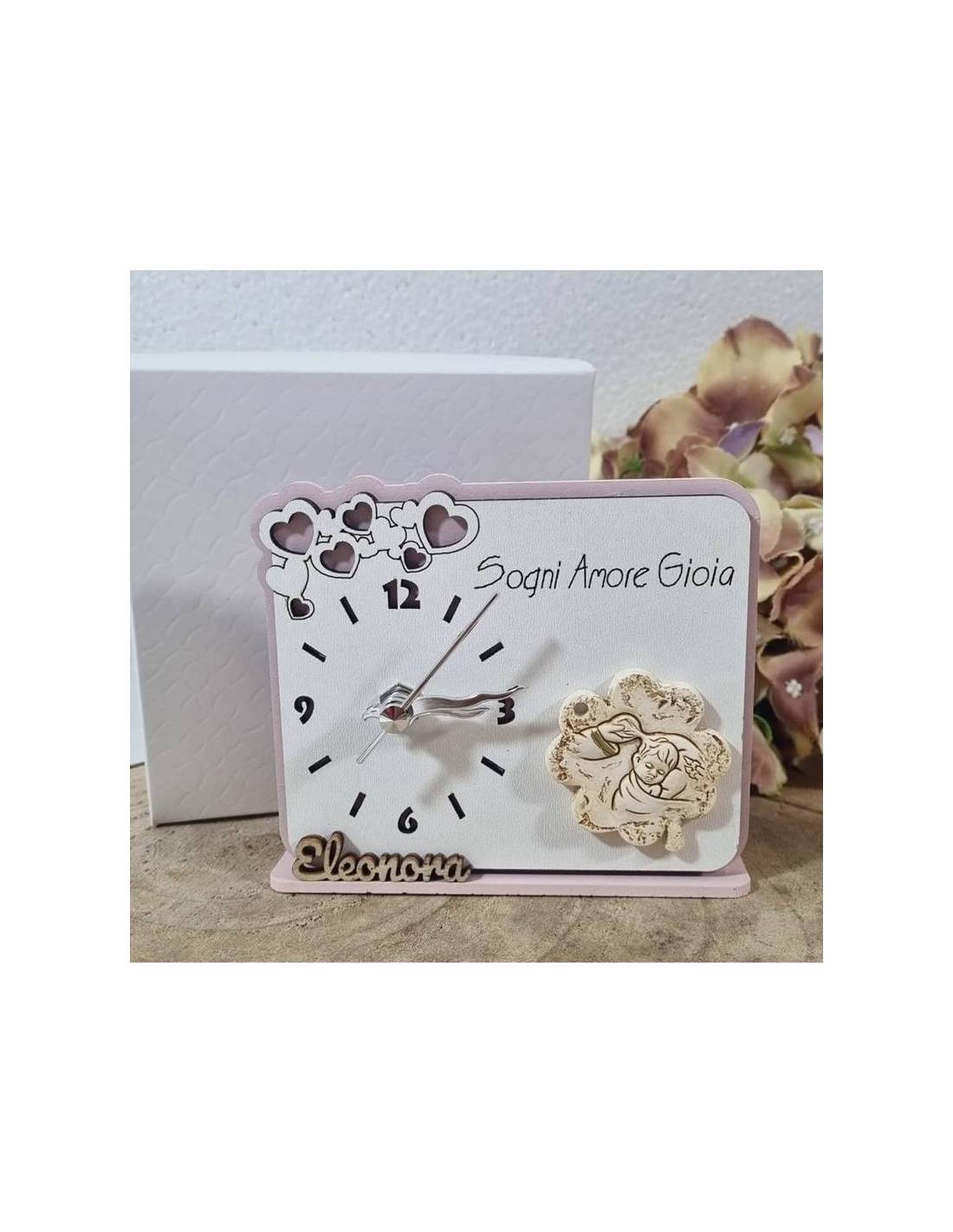 Bomboniere personalizzate orologi rettangolari bianchi e rosa con dettagli cuoricini, frase "Sogni Amore Gioia", applicazione quadrifoglio portafortuna icona sacra famiglia e nome personalizzato in legno.
