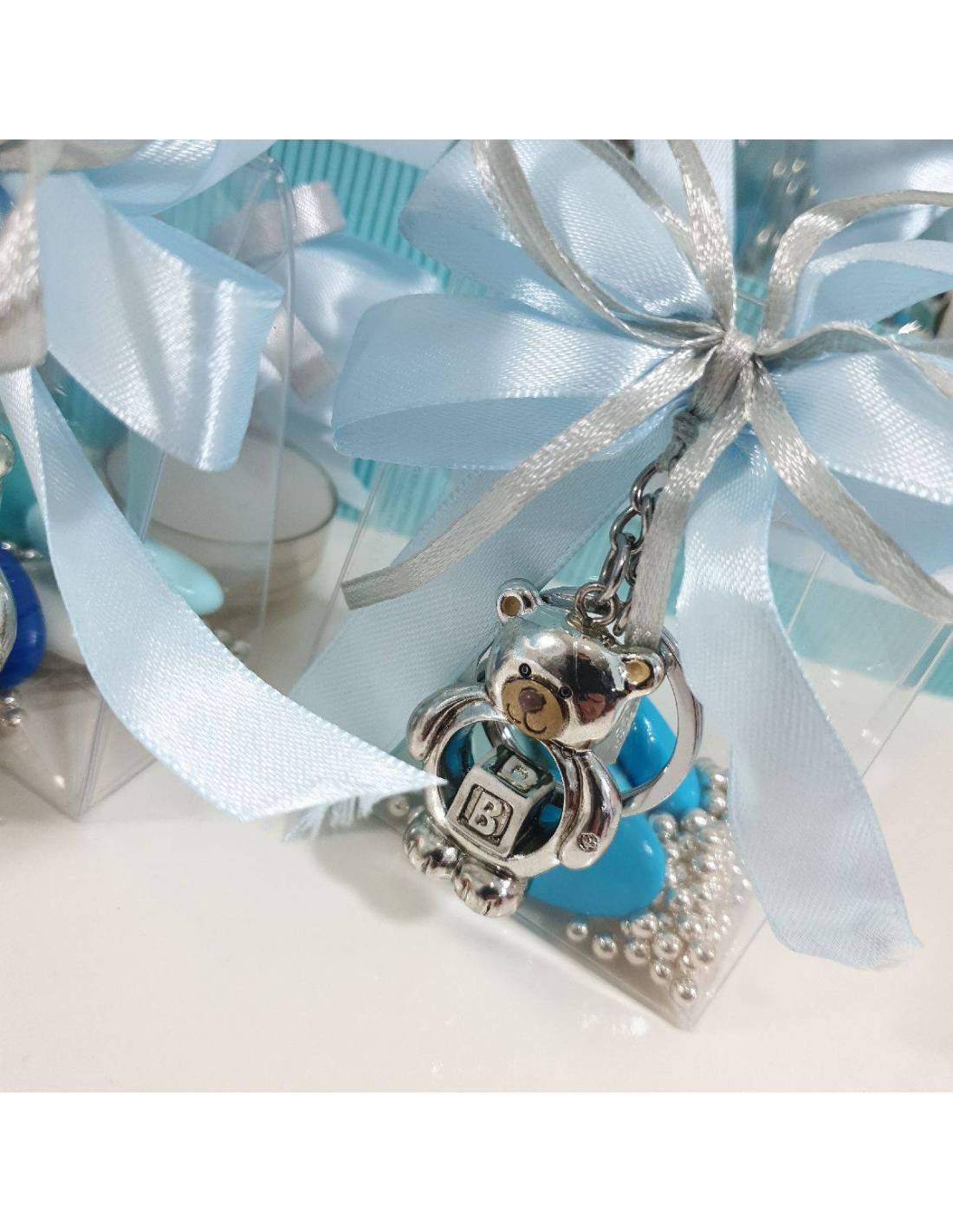 Idee bomboniere Battesimo eleganti e complete di tutto: scatolina in pvc, 5 confetti sfumati, perline, bigliettino, nastri e portachiavi.