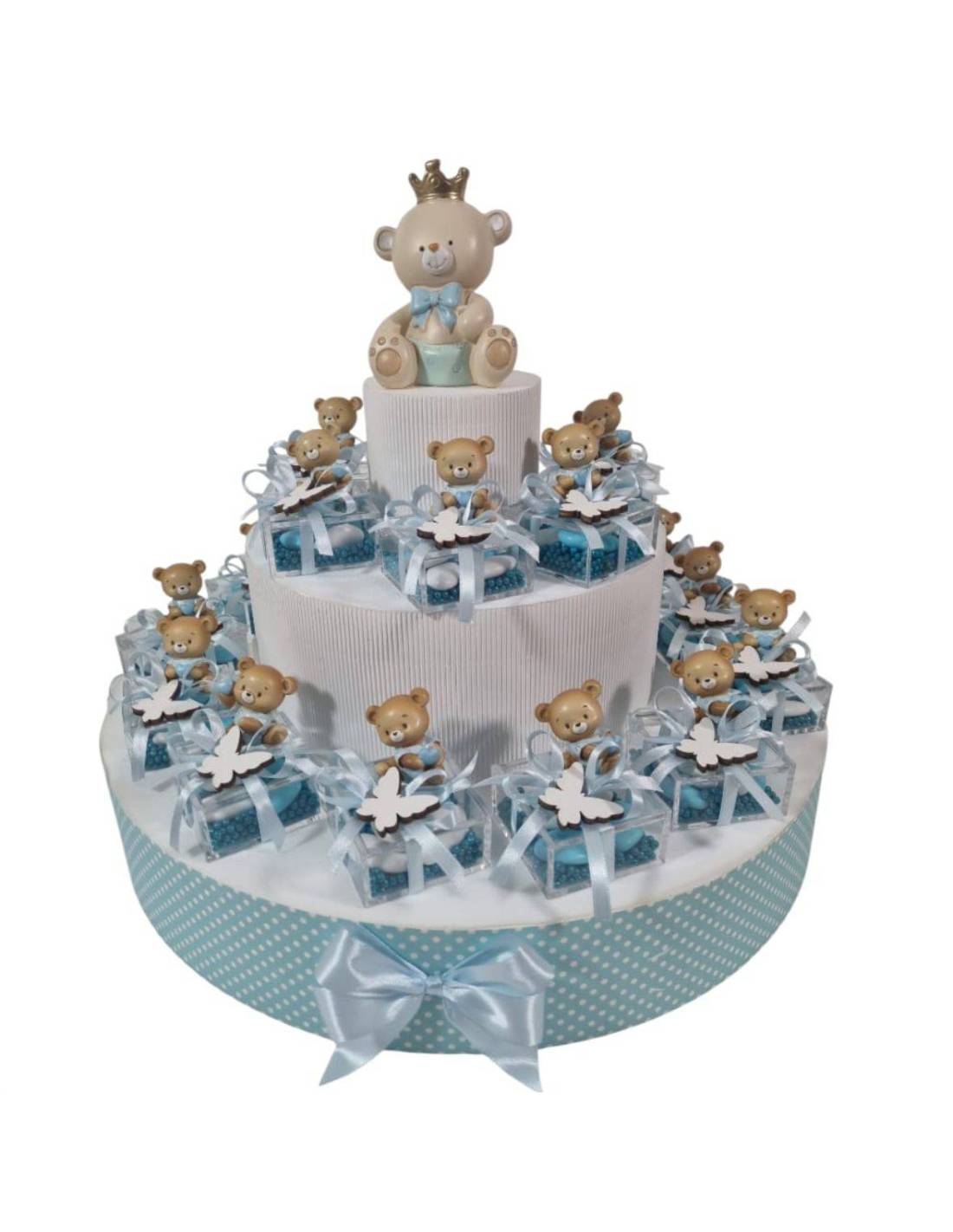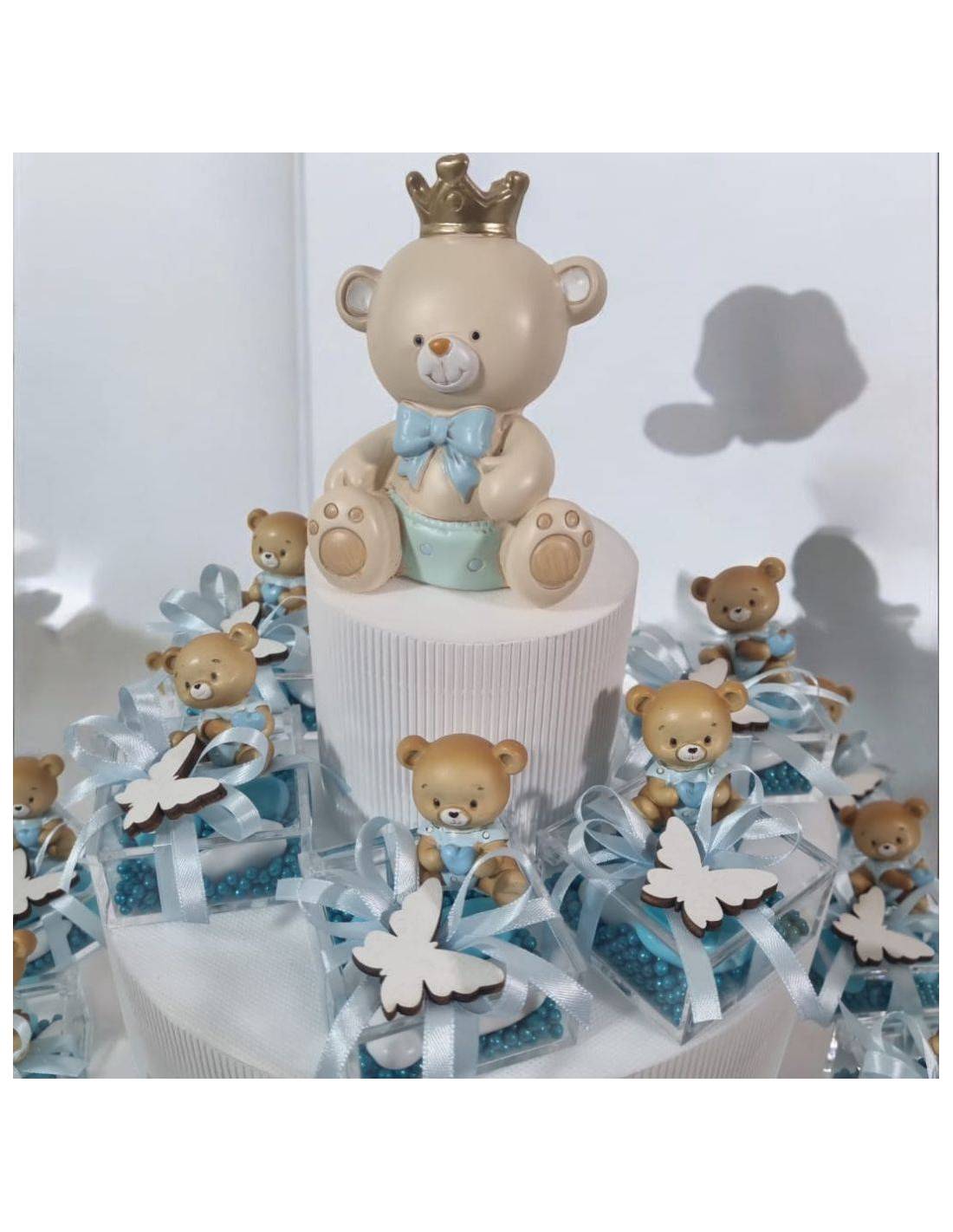 Torta bomboniera per Battesimo, composta da stupendi plexiglass quadrati riempiti di confetti azzurri decorati con fiocco azzurro e una farfallina bianca a tema arricchito da un bellissimo orsacchiotto da appoggio.