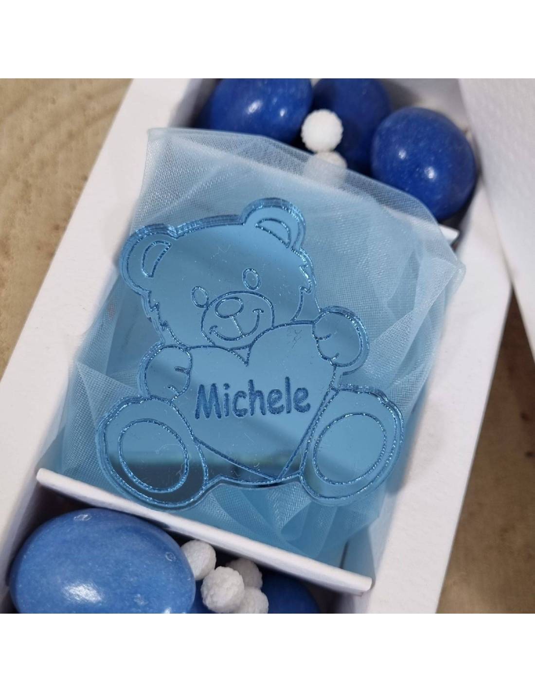 Orsetti per bomboniere azzurro in plexiglass con cuore che ha l'incisione del nome del festeggiato con scatola a scomparti con confetti ciocomandorla colori sfumati.