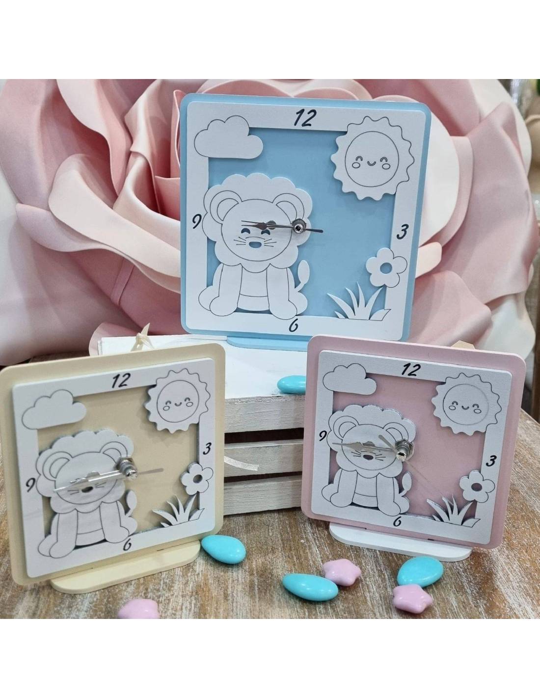 Gli orologi bomboniere tema re leone sono disponibili in tre colori beige, rosa, celeste e 2 dimensioni: