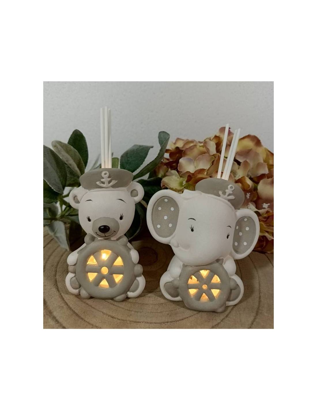 Statuine bomboniere battesimo profumatori raffiguranti elefanti e orsetti misti tema mare.