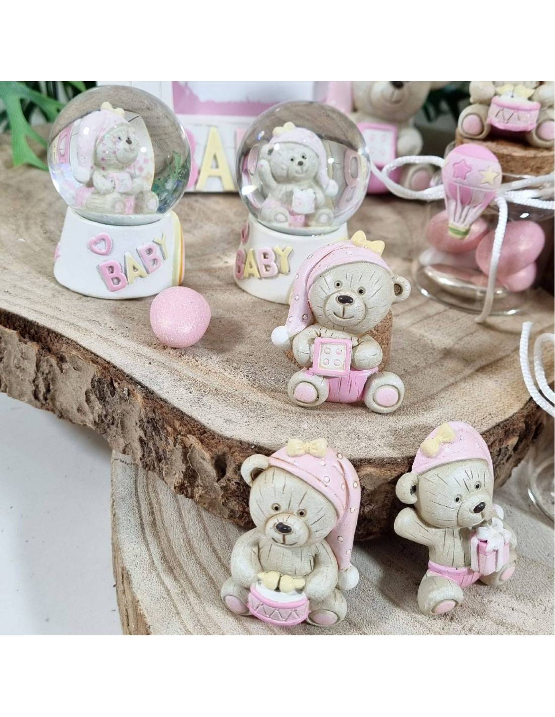 Bomboniere solidali bambini femminuccia orsetti simpatici con il cappellino rosa e fiocco giallo in testa, decorate nei minimi particolari.