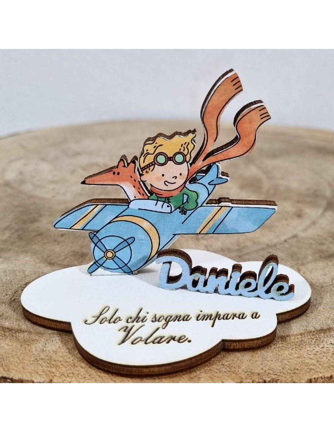 Idee bomboniere Piccolo Principe in legno con frase incisa Solo chi sogna impara a volare, e nome personalizzato.
