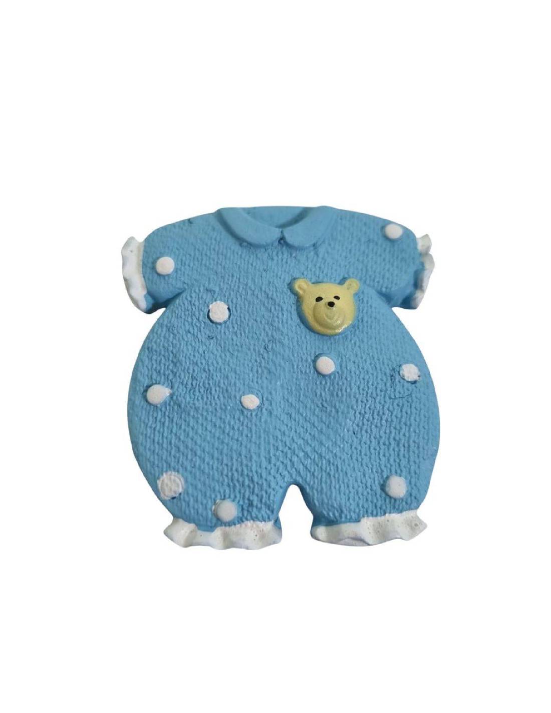 Calamite che rappresentano una tutina azzurra con orsetto in rilievo in resina e dipinta a mano.
