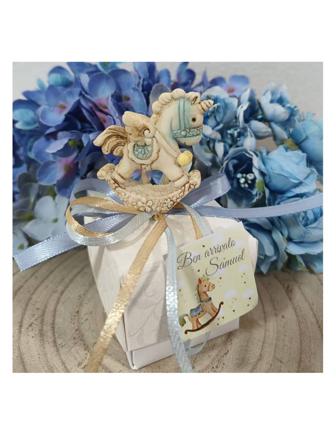 Bomboniere Battesimo personalizzate con tag unicorno in resina su scatolina con confetti e fiocco.