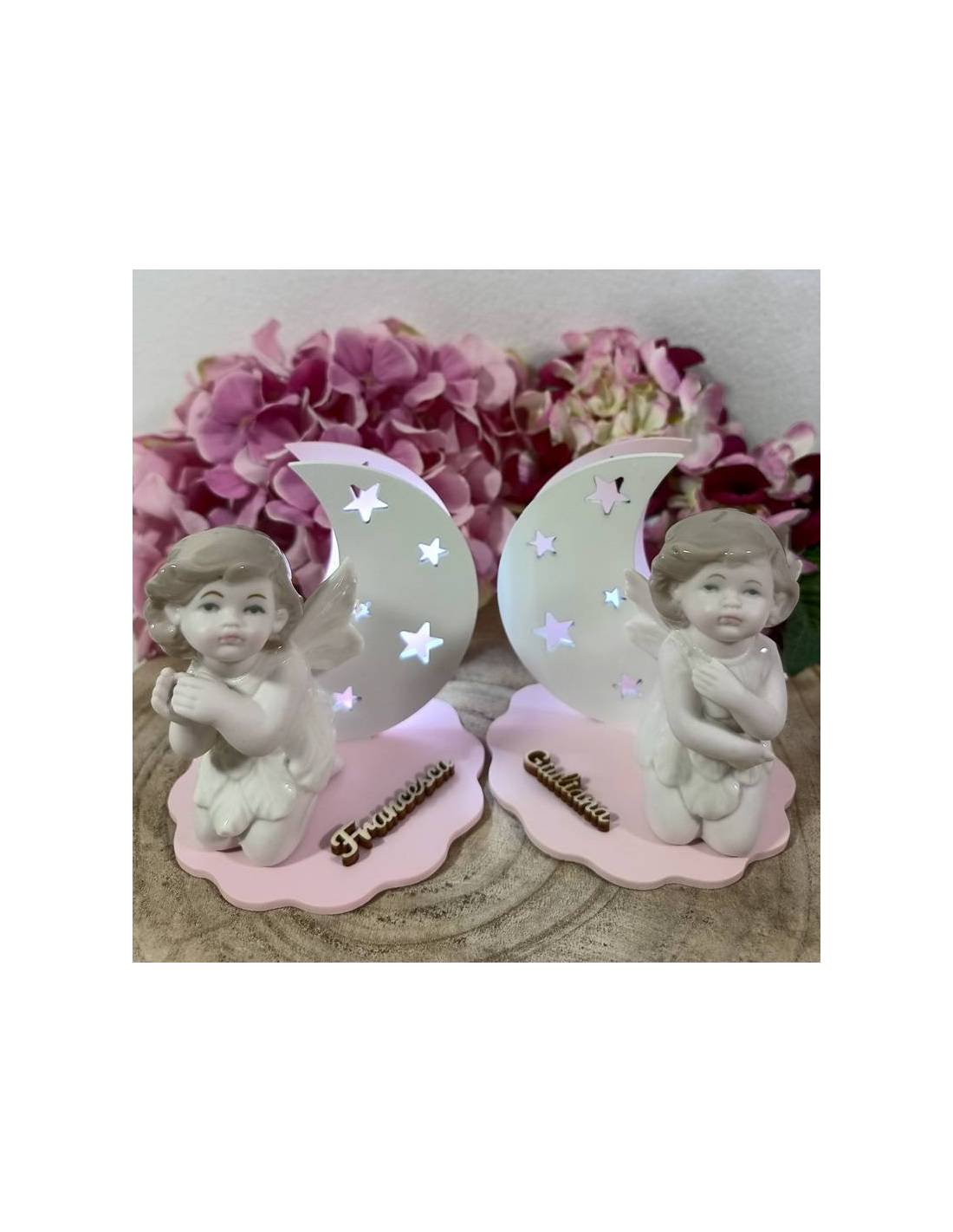Bomboniere particolari mezza luna lampada led con statuine miste due modelli bambina angioletto con nome personalizzato in legno.