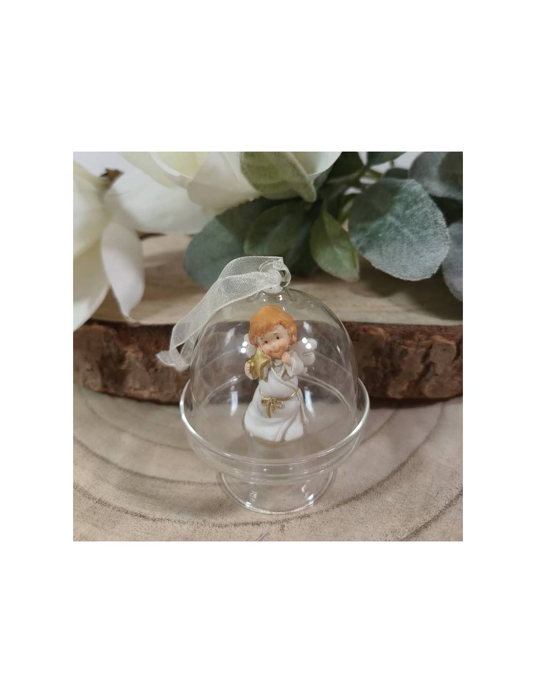 Bomboniere particolari campana appoggio con decoro appendino nastro panna con all'interno angelo con stellina dorata ideale per evento Battesimo o Comunione.