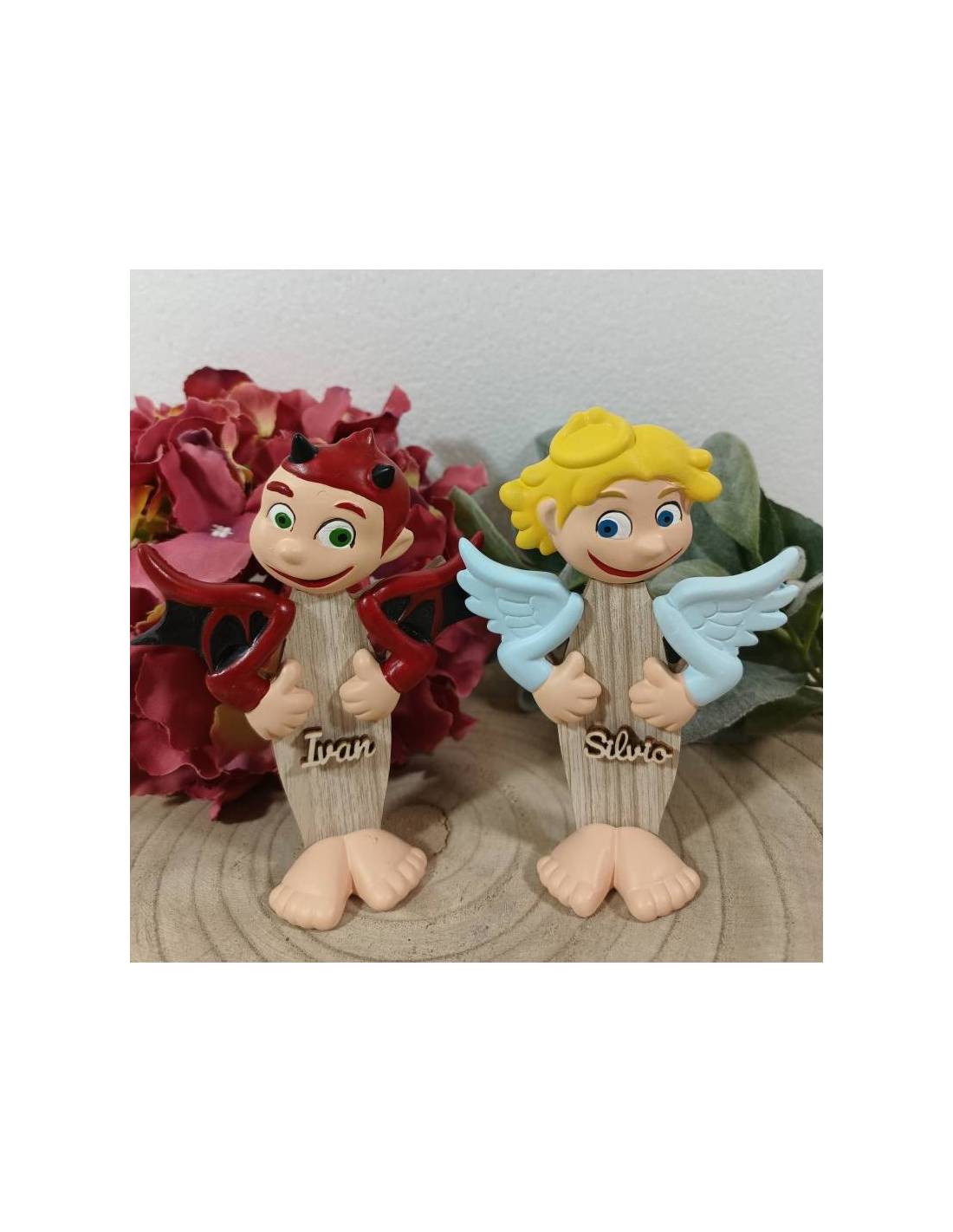 Bomboniere battesimo originali che rappresentano l'angelo e il diavoletto in legno e ceramica.