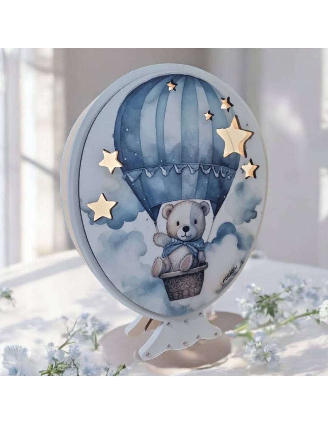 Bambino con tutina orecchie e sfera in alto bomboniere battesimo
