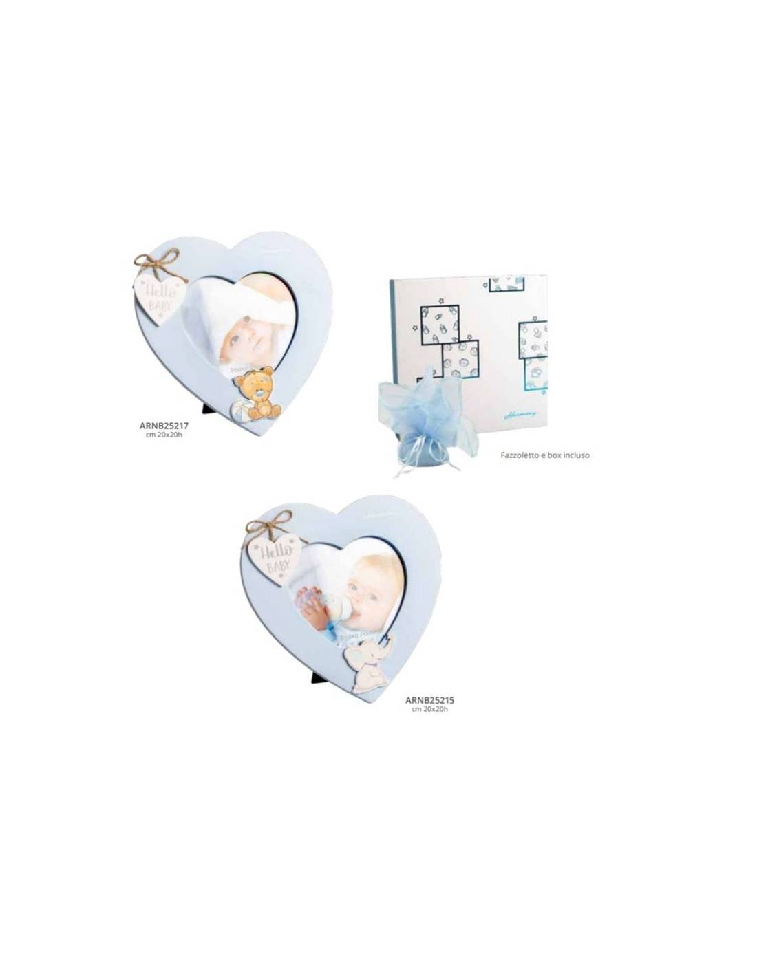 Cornici portafoto in legno celesti a forma di cuore decoro cuore 'Hello baby' con possibilità di scelta tra portafoto animaletti orsetto o cornice portafoto elefante.