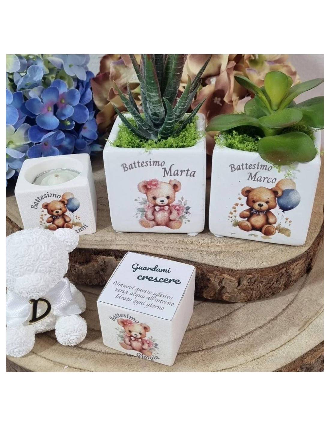 Bomboniere Battesimo orsetto portapianta in ceramica con piante artificiali di vari modelli dimensione 6,5*6,5 cm circa (a parte la piantina)