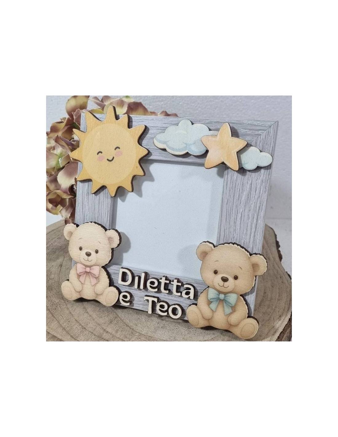 Bomboniere personalizzate bellissima cornice portafoto quadrata effetto legno con applicazione sole, nuvole, stella e animaletti orsetti bimba e bimbo.