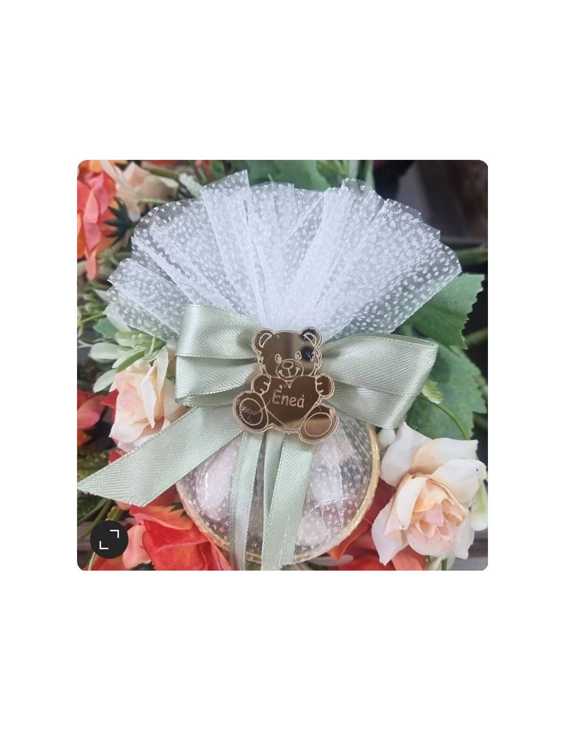 Bomboniere portaconfetti cerchio e tulle bianco con fiocco verde applicazione orso in plexiglass dorato personalizzato con il nome del festeggiato.