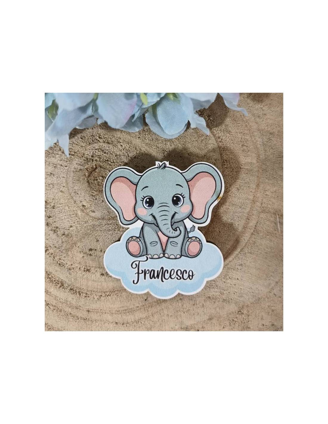 Bomboniere personalizzate calamite magnetiche che rappresentano elefantino in legno con nome personalizzato su nuvoletta ideali anche per evento Nascita.