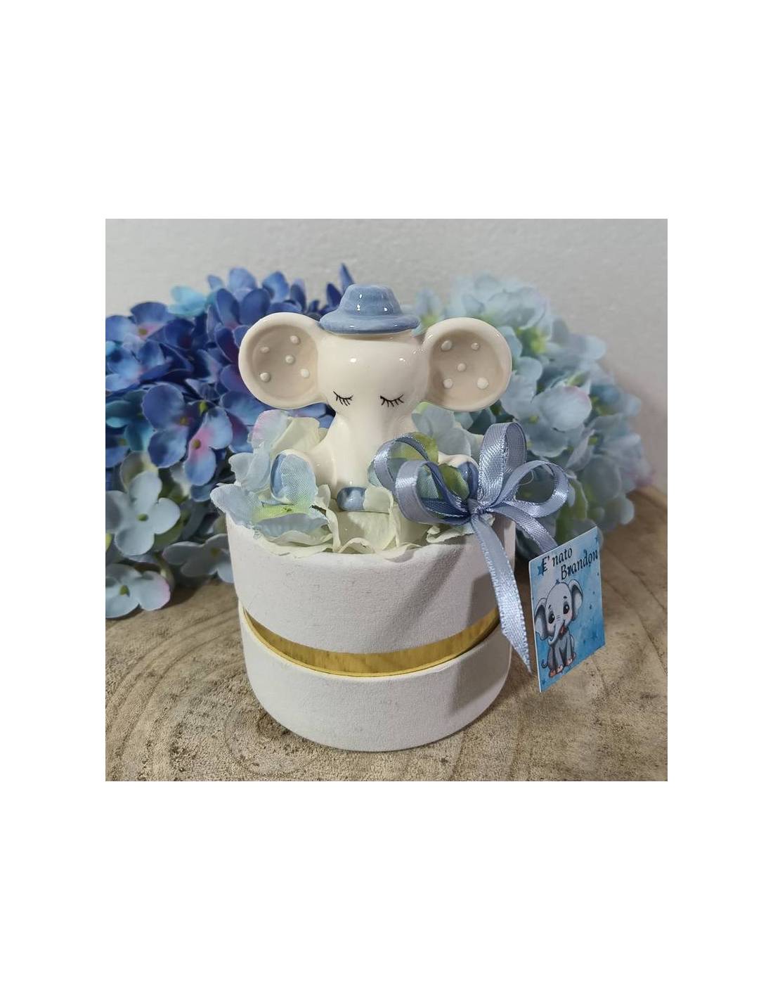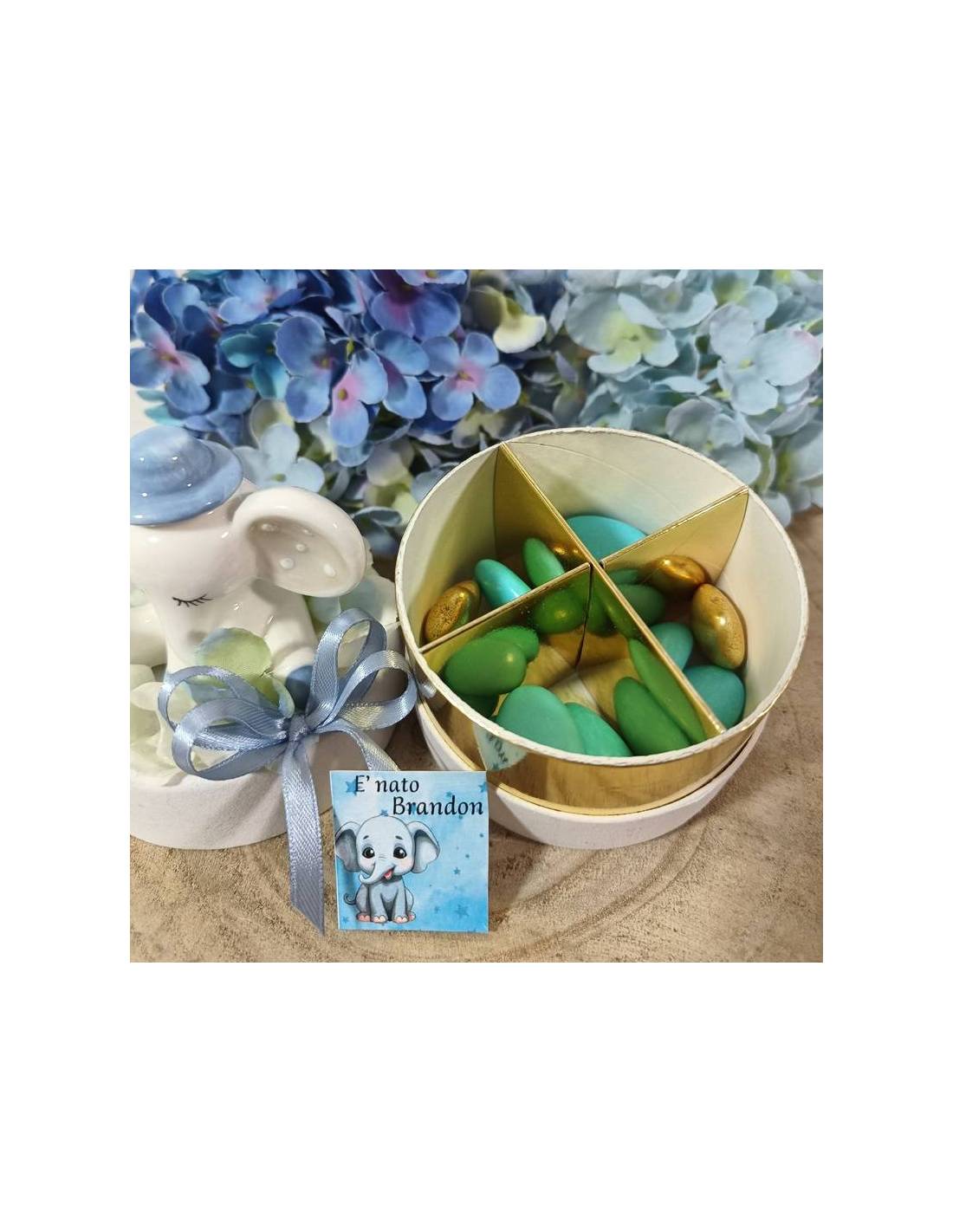 Bomboniere Battesimo Elefantini in porcellana su scatola degustazione confetti ideali per bimbo.